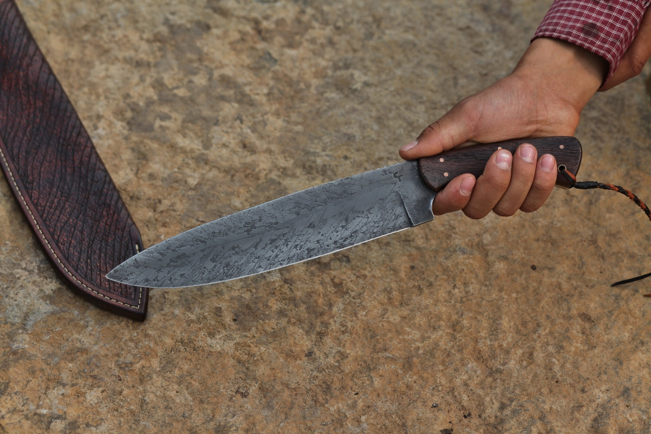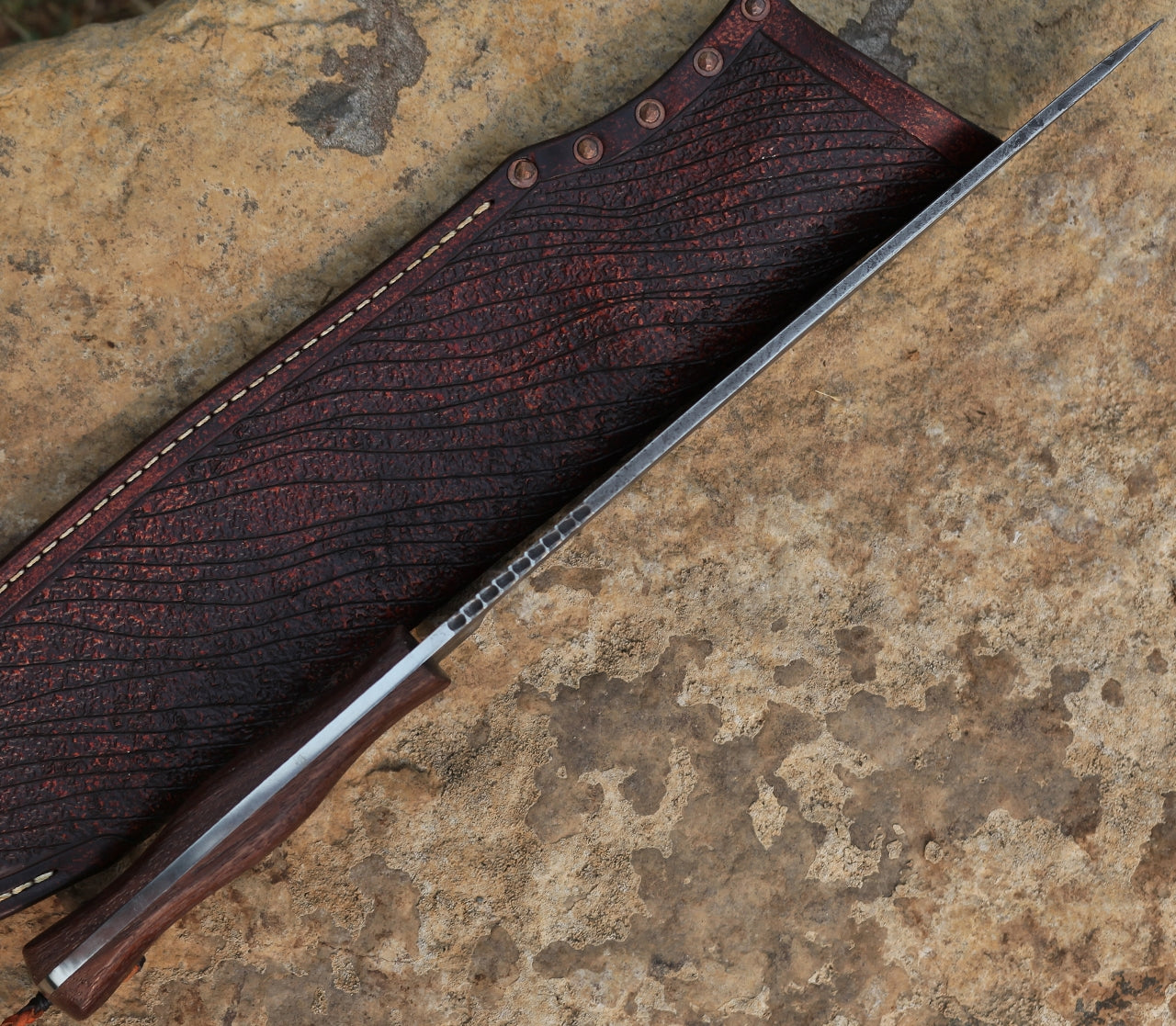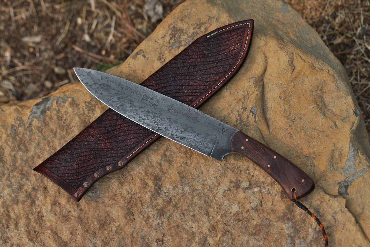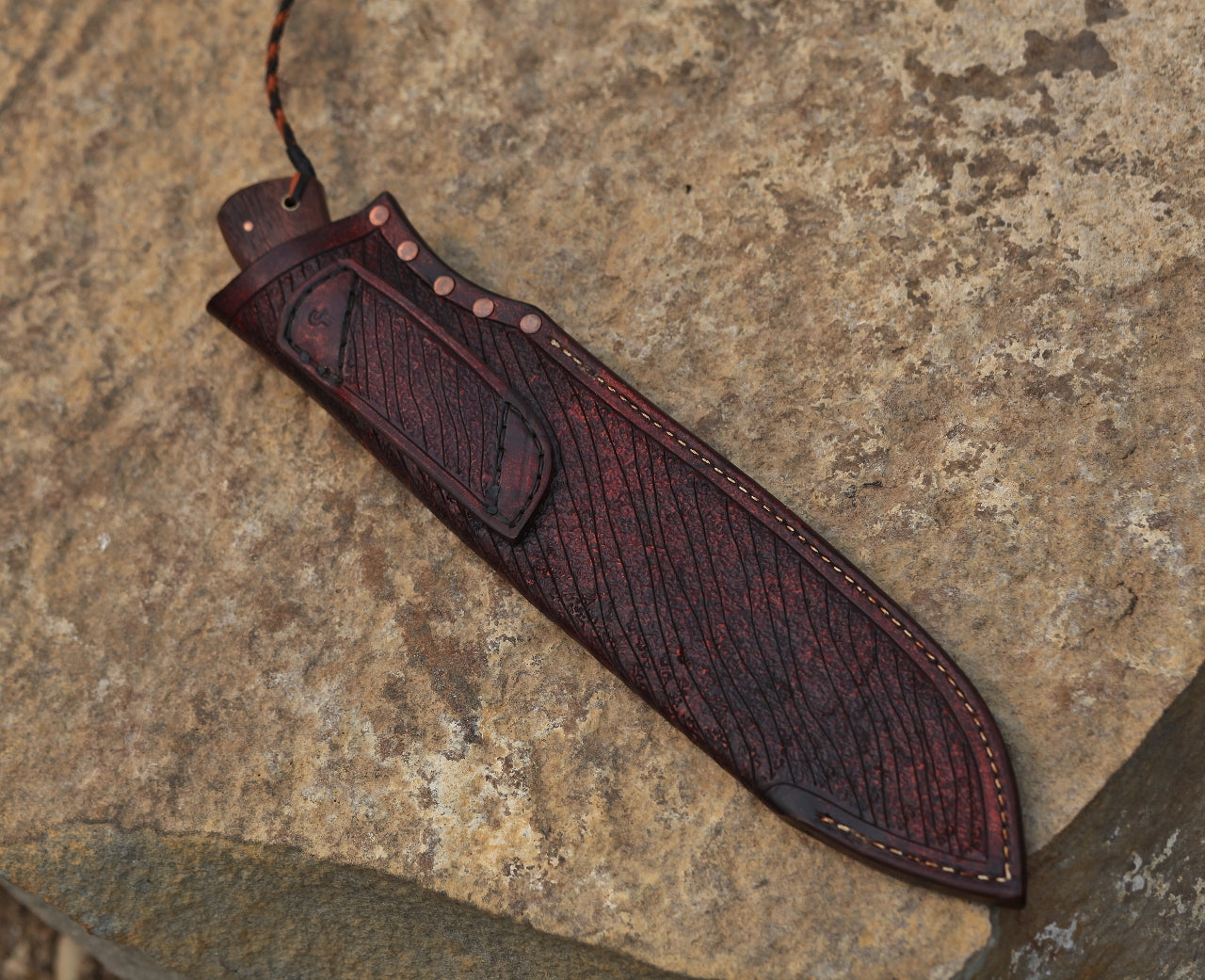 - Heavy weight leather sheath is hand tooled and wet molded to this knife. Knife is secure and deeply seated in the sheath.