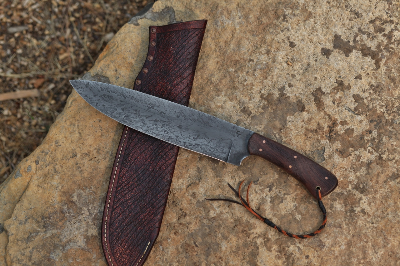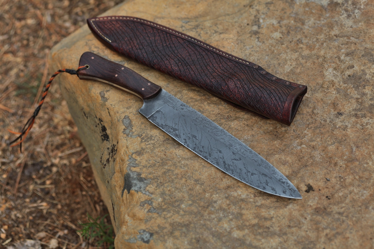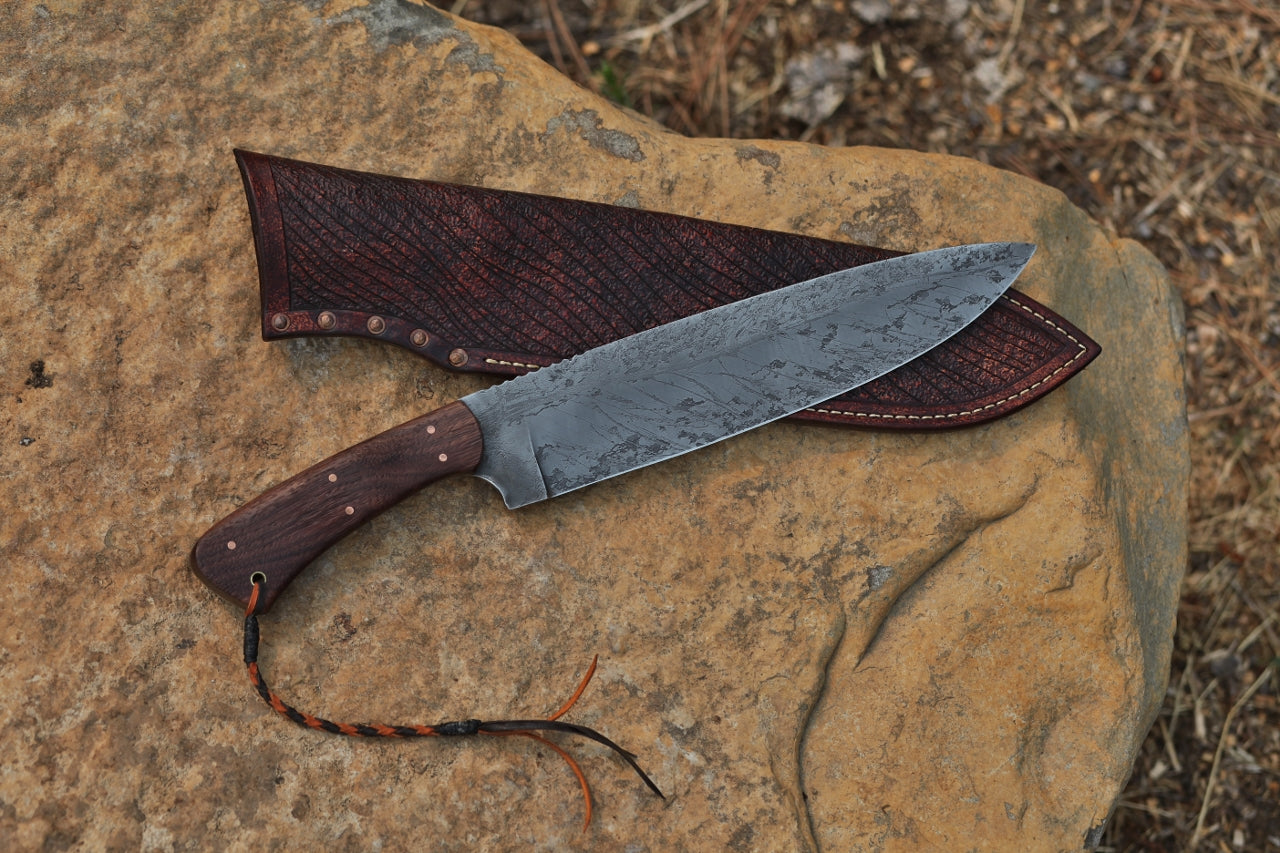 - Handle is textured African rosewood. Contoured shape (palm swell) feels right in the hand. Copper pins. Braided kangaroo lace "pull"