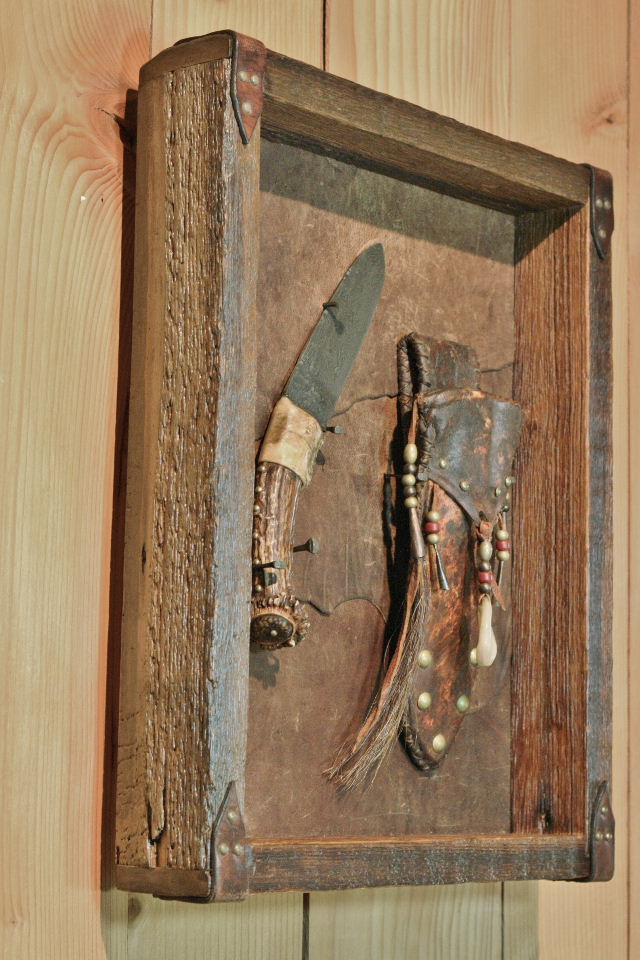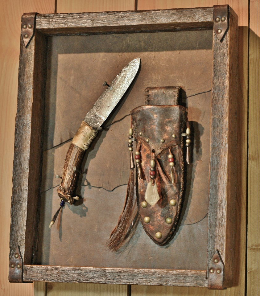 I custom made the leather lined shadow box for this piece, horse hoof nails hold the knife and sheath securely. The picture frame wire is on the back of the box so it's ready to go, you just need a nail to hang it up.