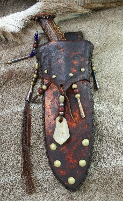 Leather sheath is deer rawhide wrapped and hand sewn with linen.