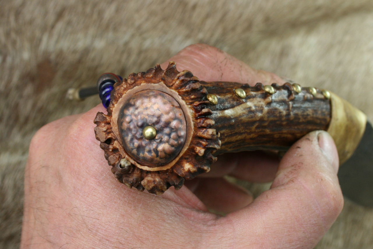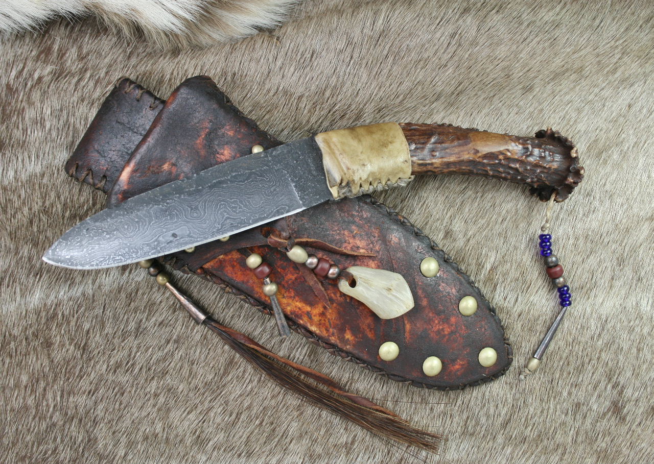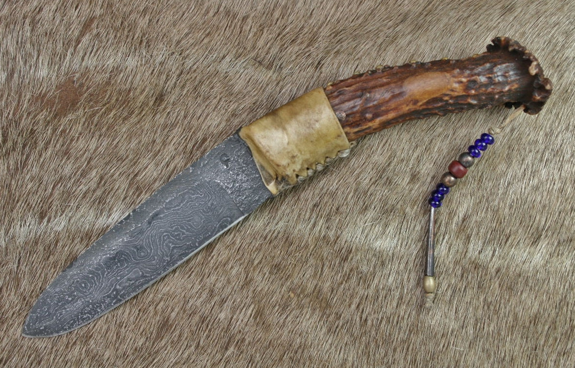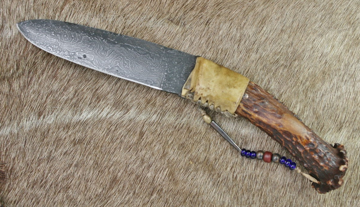 Frontier Damascus skinner/hunter, hide glue and deer rawhide holds the 378 layer Damascus blade. I made the blade from 01 drill rod, mild steel and old circular saw steel. Handmade copper butt cap, brass tacks and trade beads adorn the whitetail antler handle.