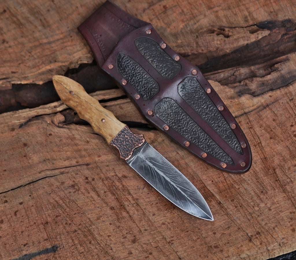 - Heavy weight leather sheath is hand tooled with copper rivets.