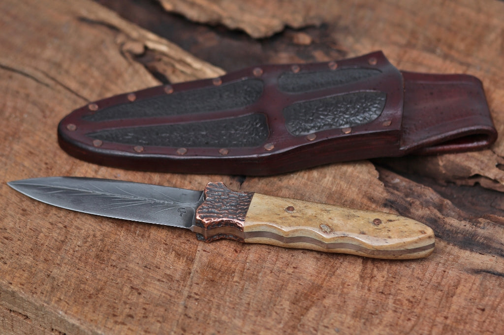- Handle is fossilized oosik (walrus penile bone, yes, really !) with copper bolster and copper pins.