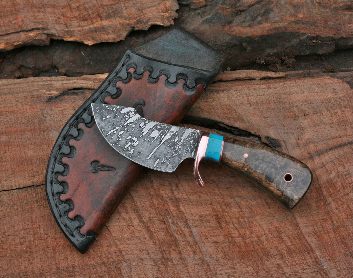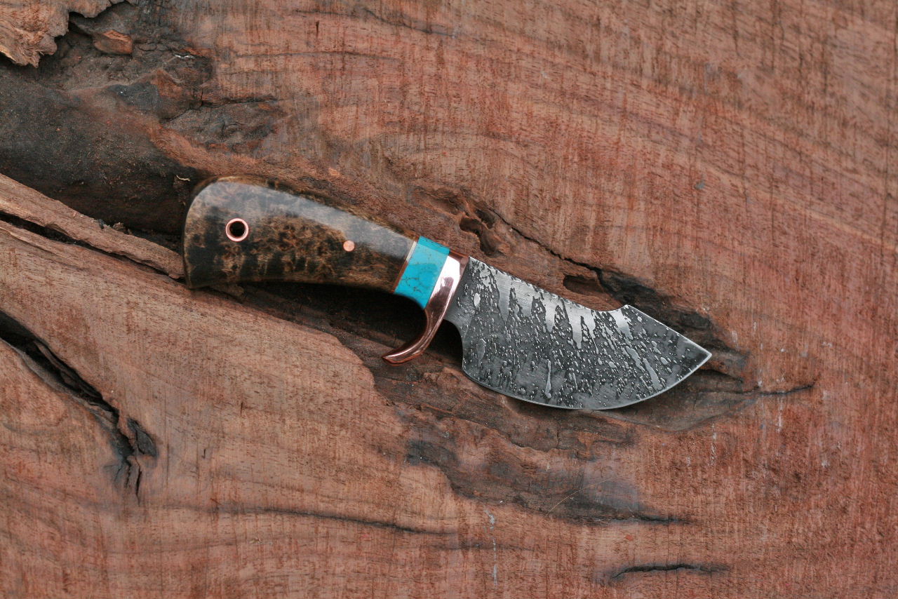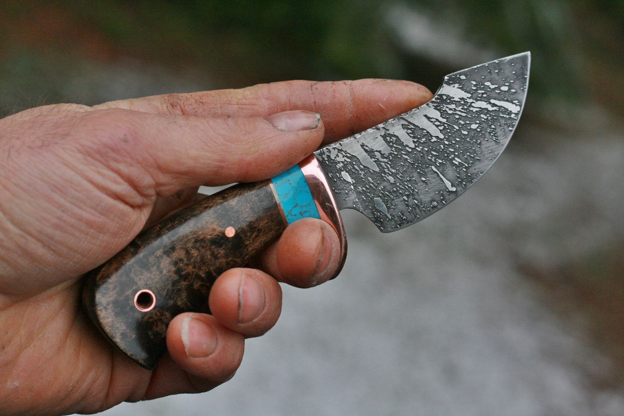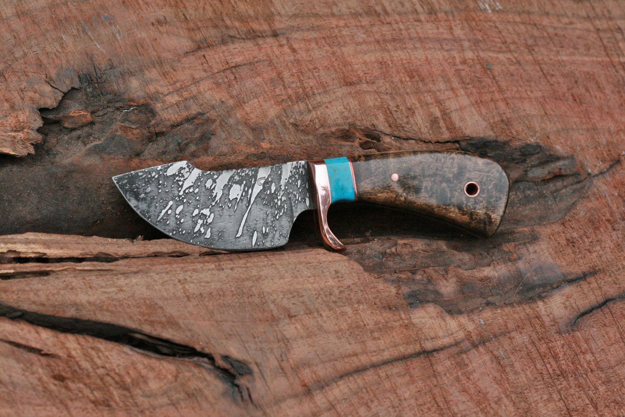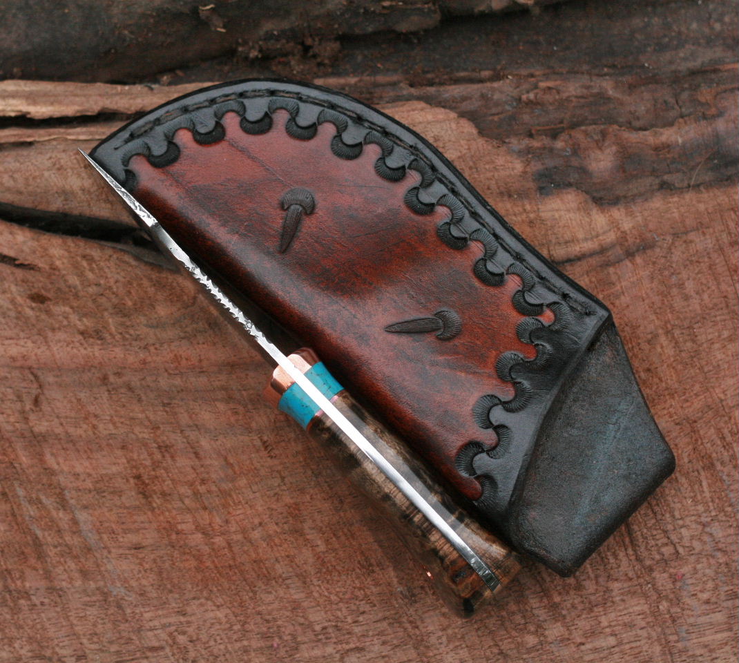 - Handle is dyed birds eye maple with reconstituted tourqoise, black liners and copper fittings