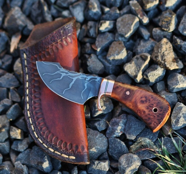 - Hand tooled leather sheath is wet formed and custom for this knife.