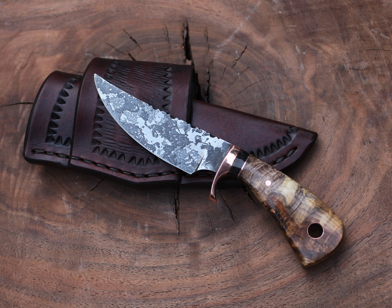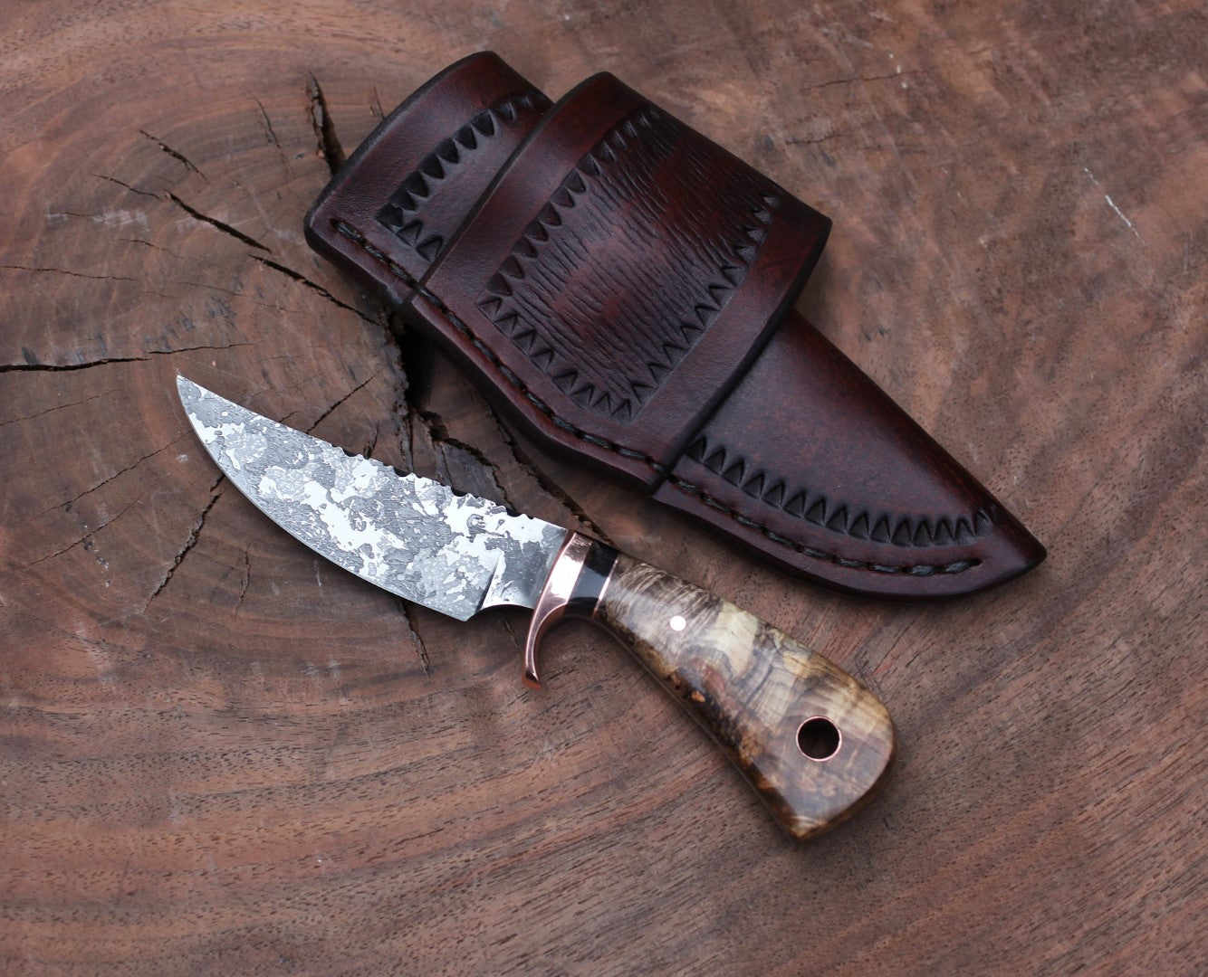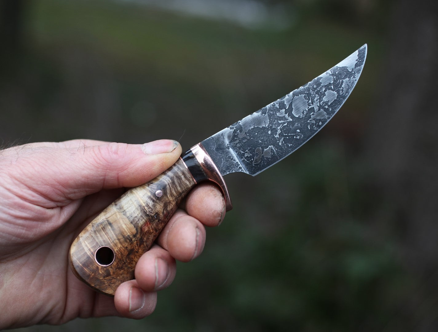 - Handle is stabilized box elder wood with water buffalo horn spacer and copper fittings.