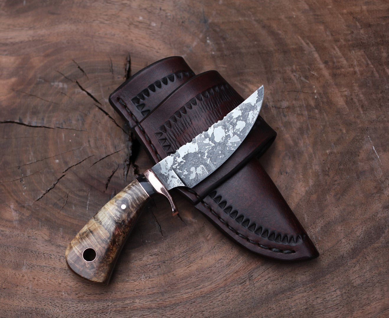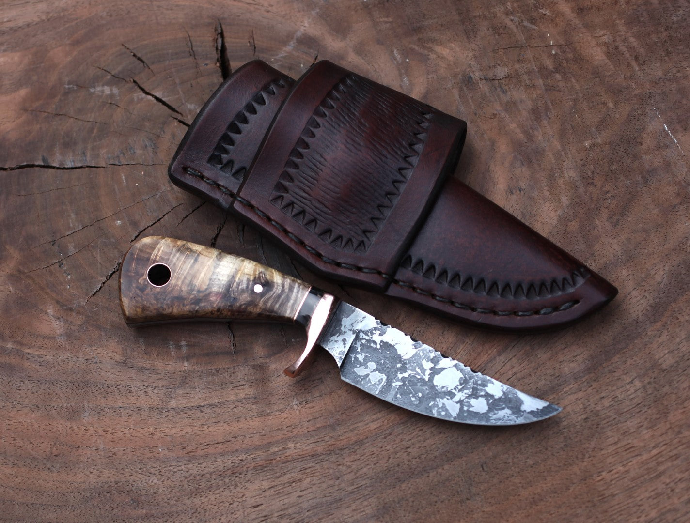 - Leather sheath is wet formed and custom for this knife. Knife " pops ' into sheath.