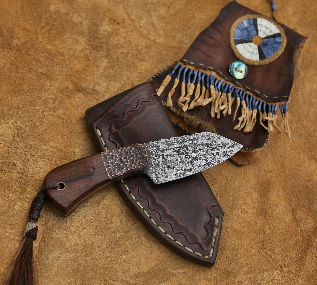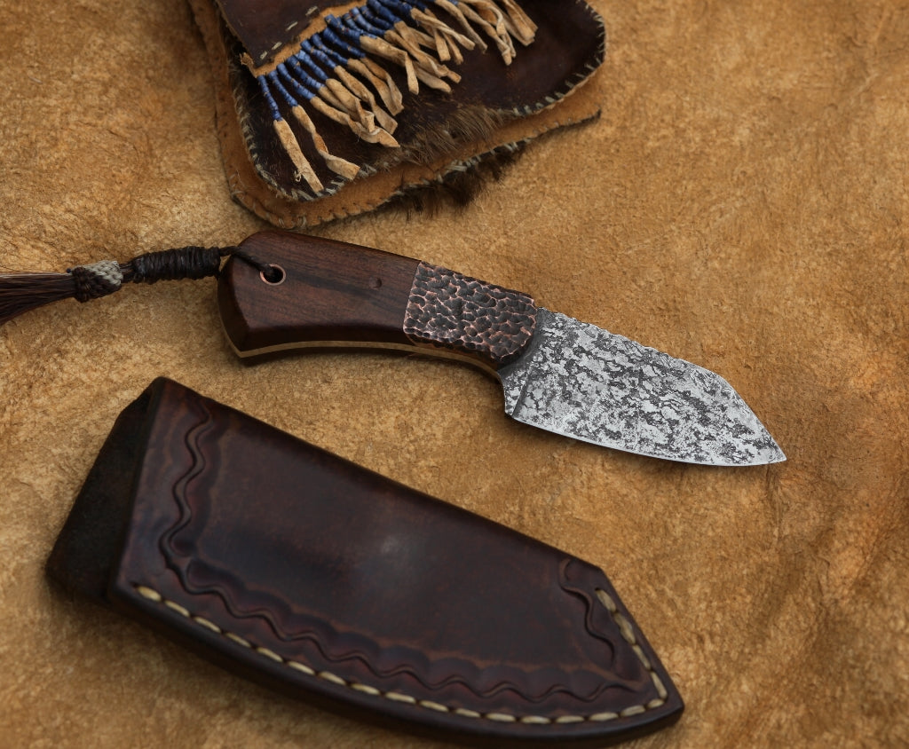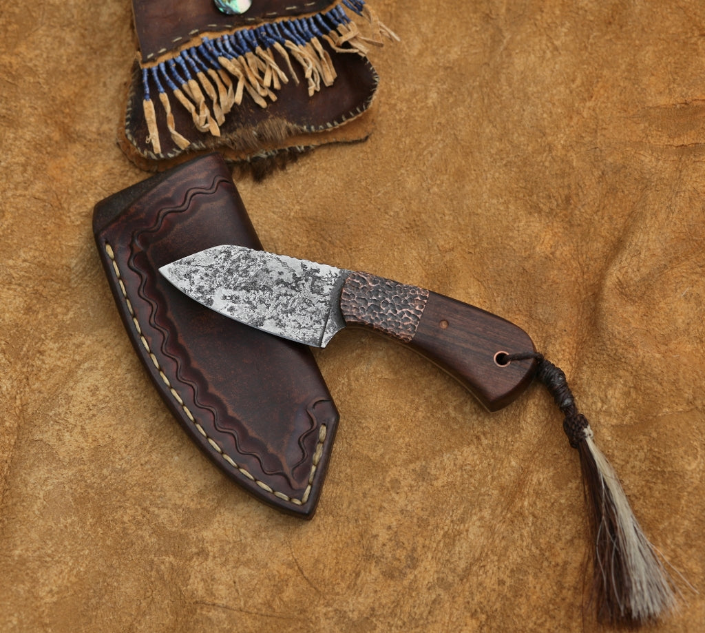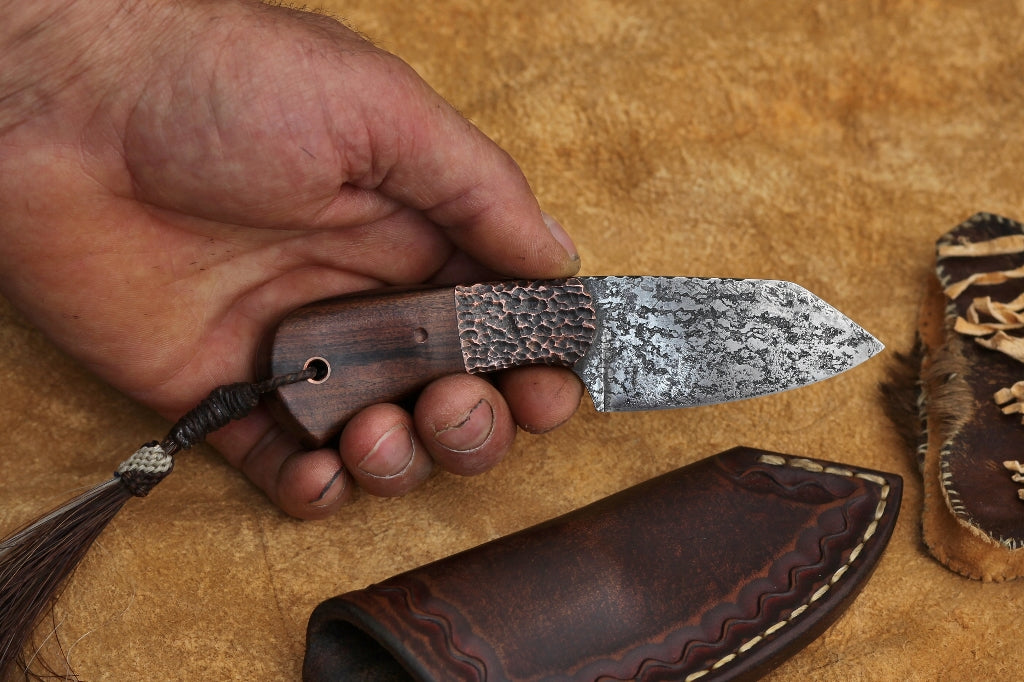 EDC, spay point utility crafted from Idaho lumber mill saw steel, reground, oil heat treated, tempered and etched. A really nice everyday carry blade, not to big, the handle fits the 1st three fingers of a mans hand. ( Buckskin pouch not included, see Porcupine Quill Art in Favorite Artisans)