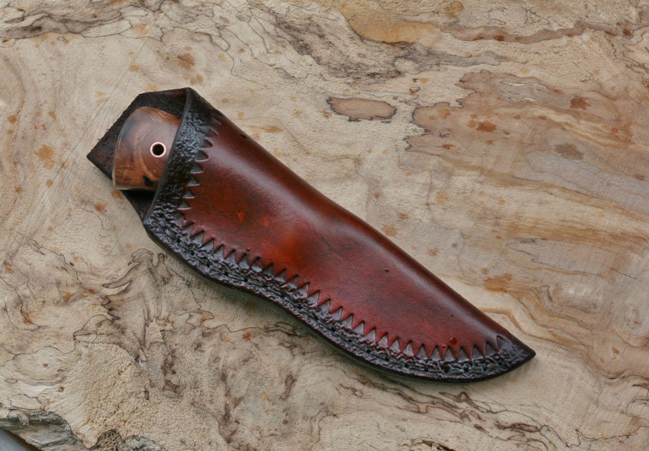 - Knife “pops” in its own custom tooled 8oz. leather sheath.