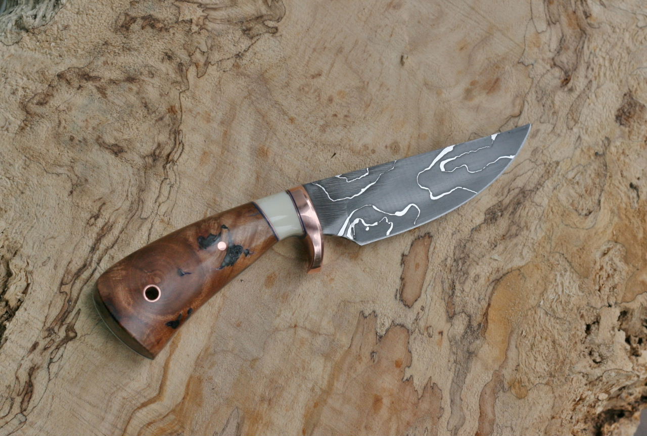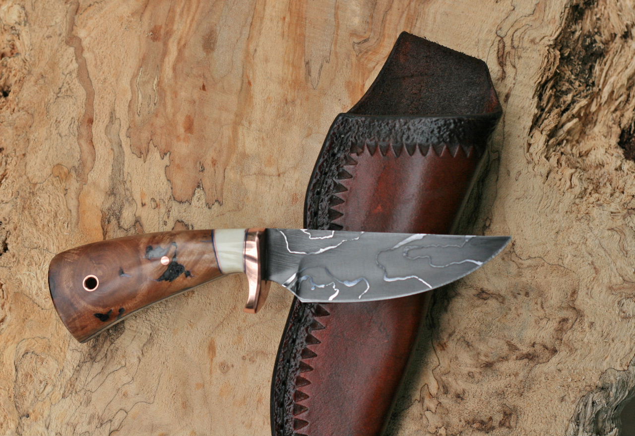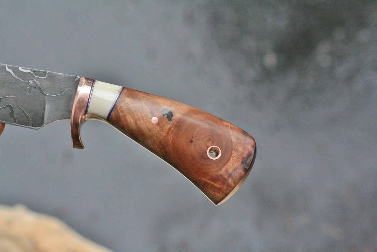 - Handle is stabilized rare madrone root, blue liners, copper fittings and a piece of old walrus tusk.