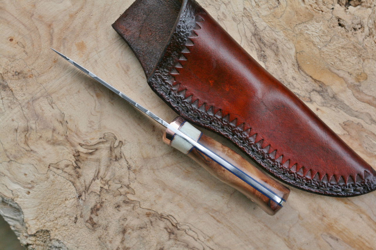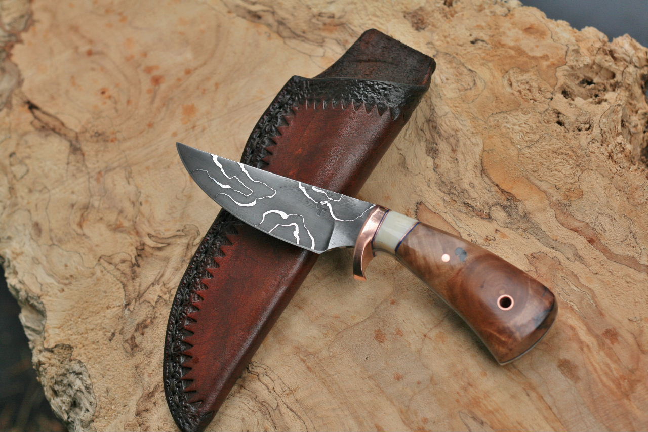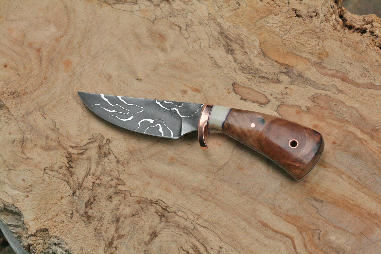 - Handle is stabilized rare madrone root, blue liners, copper fittings and a piece of old walrus tusk.