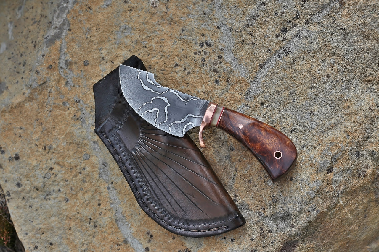 Sharp looking and razor sharp, 1/8 inch thick lumber mill saw steel is recycled. Reground and oil heat treated and tempered to a hardness of 59-60 rc. then etched. Etch is permanent.