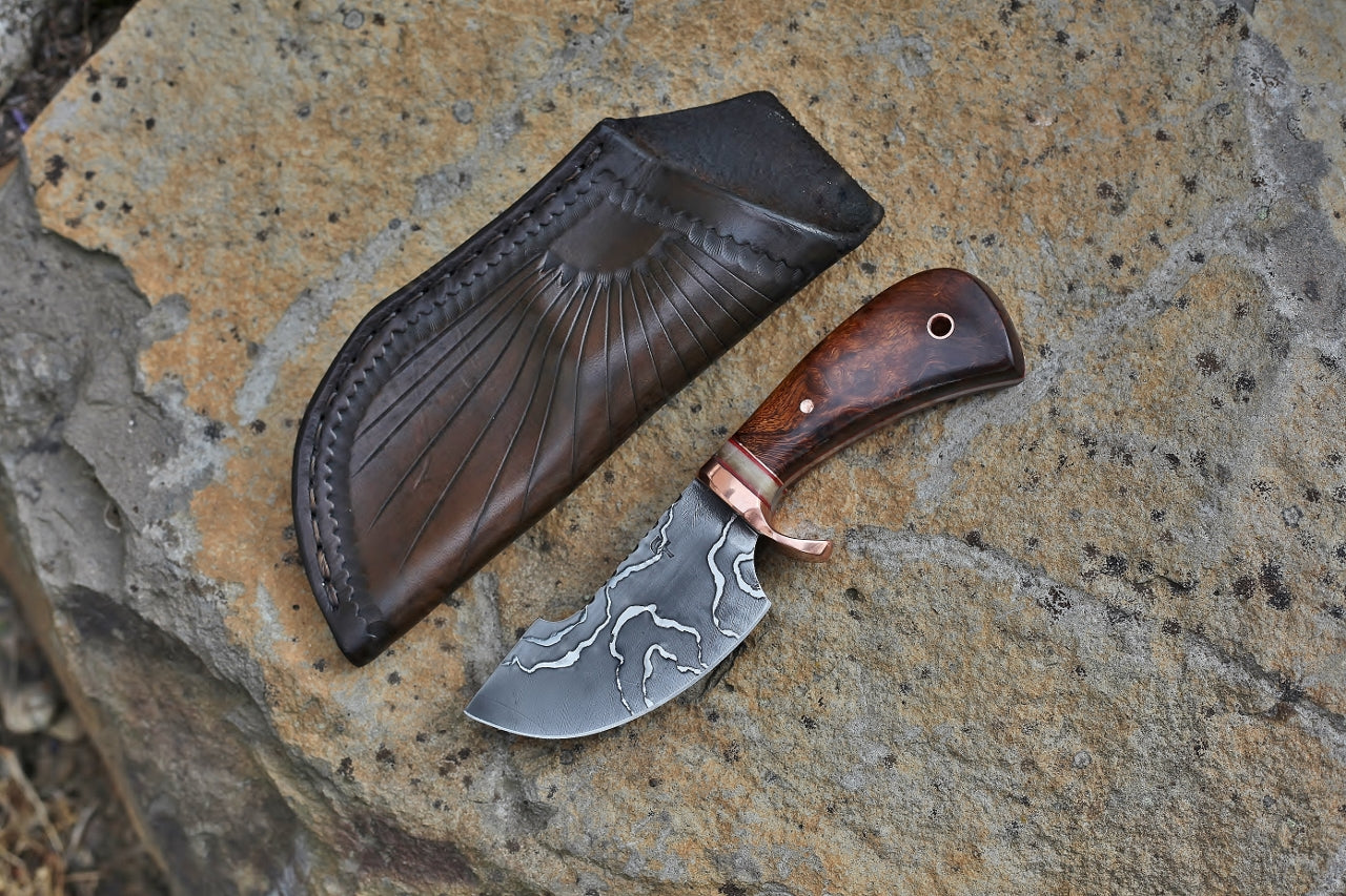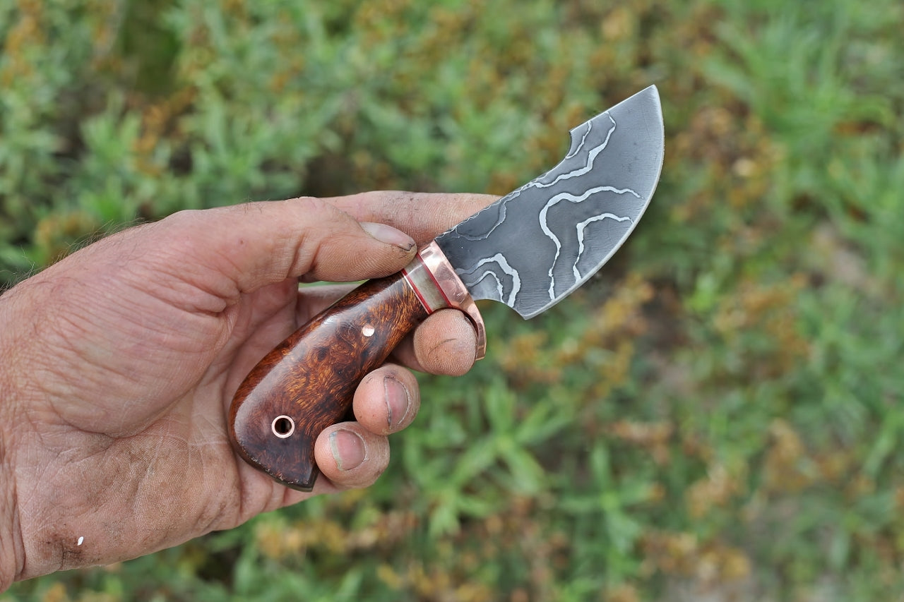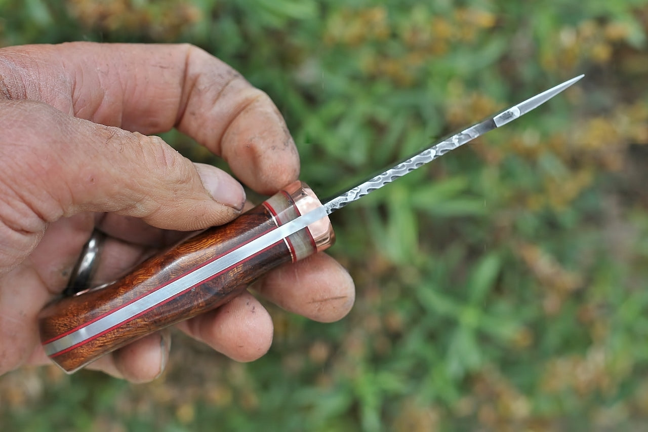 - Handle is beautiful colored Arizona ironwood with sheep horn spacer, red liners and copper fittings
