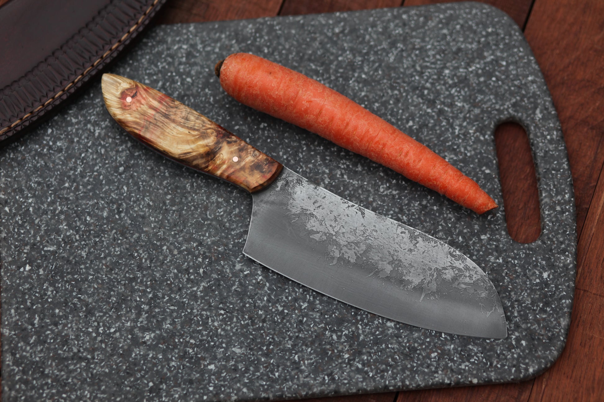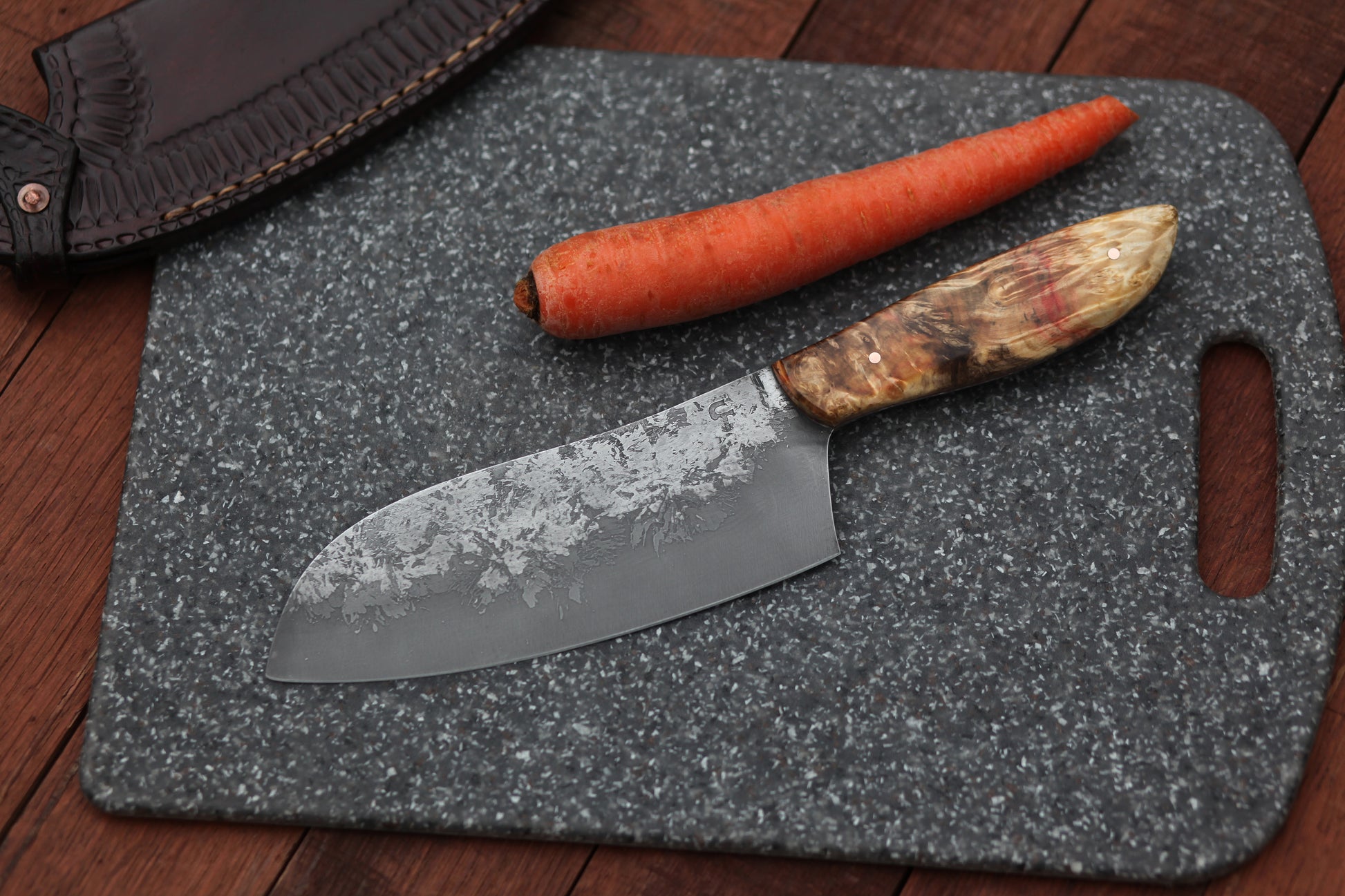 Keywords: etched carbon steel, knives, gourmet, kitchen, culinary, light cleaver, best kitchen knives, cooking, cutting board, dice, slice, restaurant, master chef, sushi, gourmet, cuisine, Henkels, Wusthof, shun, L6, nessmuk, custom, santoku