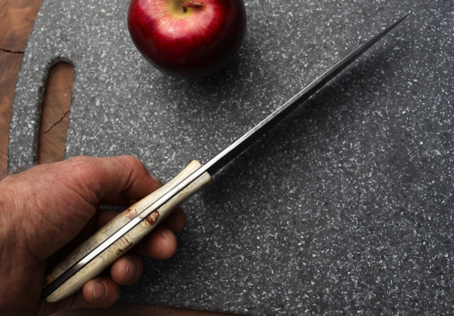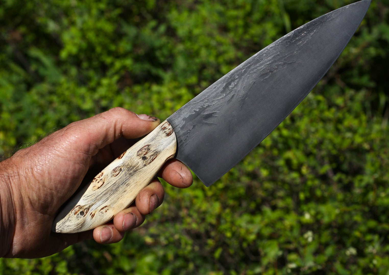 - Crafted from industrial saw blade steel, very similar to our mom’s dark colored carbon steel knives that always worked so well.