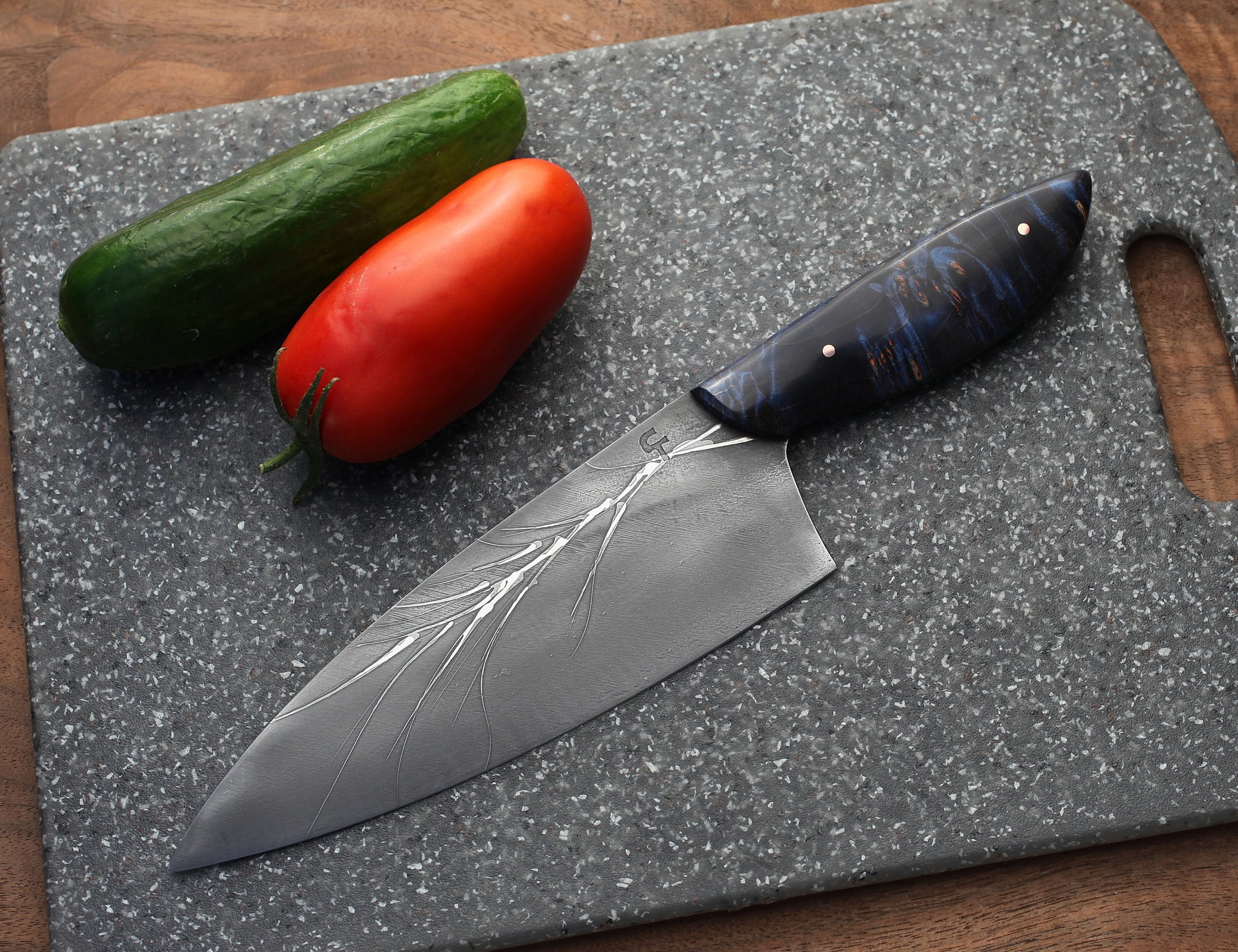 A pleasure to use. As a past restaurant owner, I know how important it is to have a tool that makes daily chores easier. Crafted from 8670 carbon tool steel ( lumber mill large circular saw ). A fine edge, great for slicing and dicing vegetables and meat.