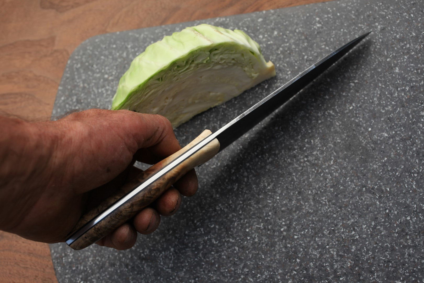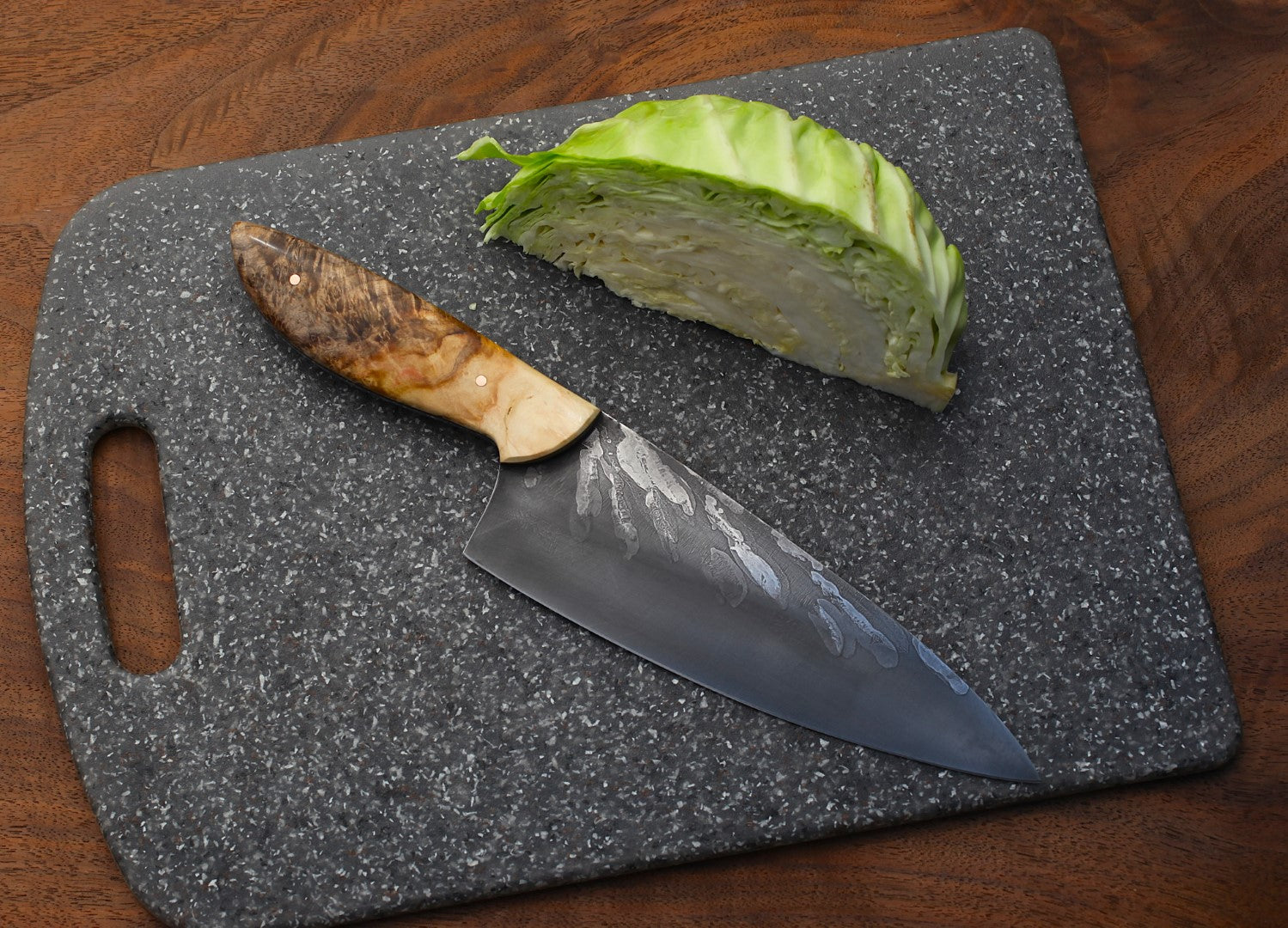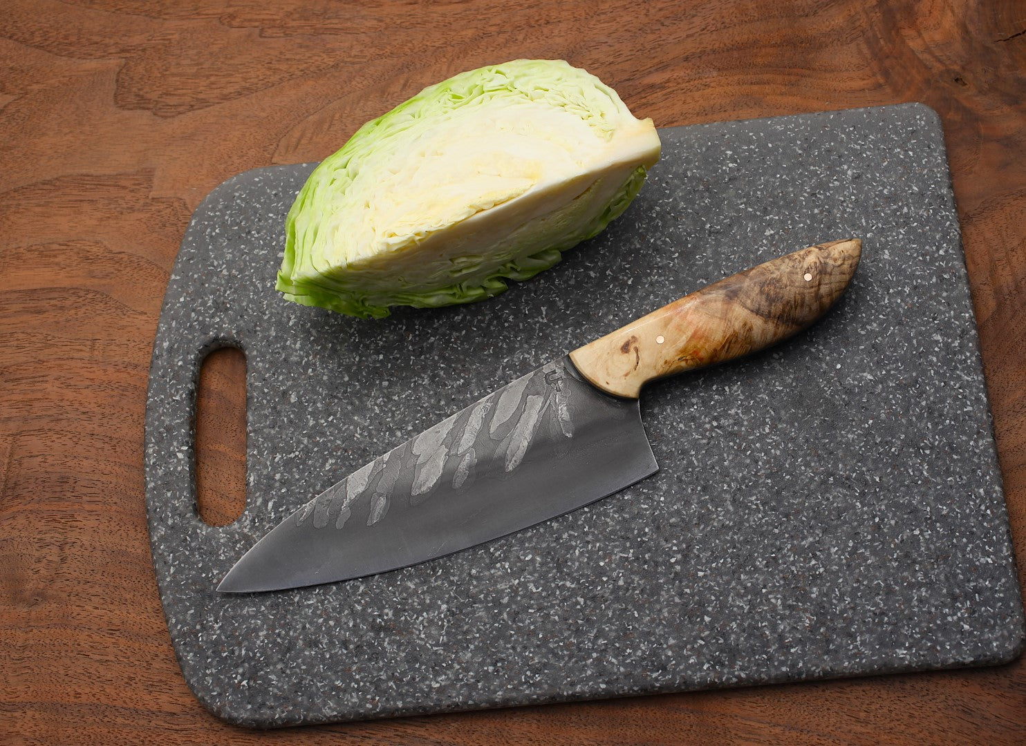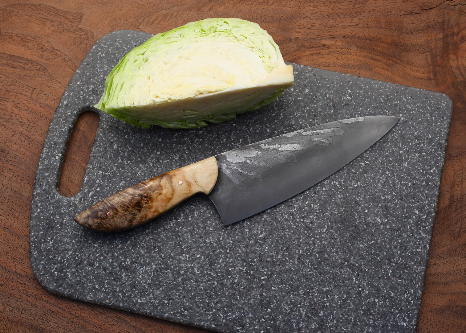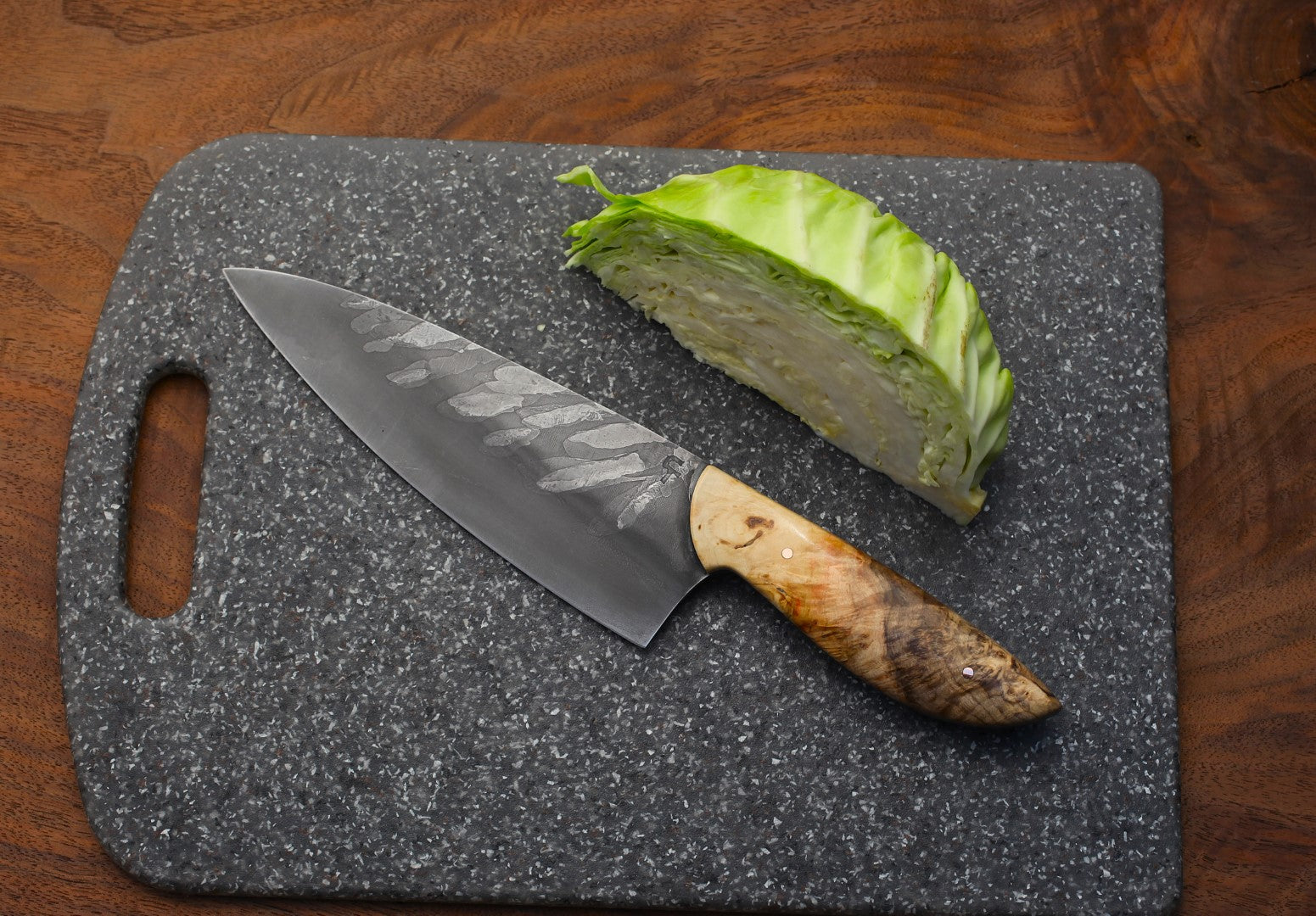 Keywords: etched carbon steel, knives, gourmet, kitchen, culinary, light cleaver, best kitchen knives, cooking, cutting board, dice, slice, restaurant, master chef, sushi, gourmet, cuisine, henkels, wusthof, shun, L6, nessmuk, custom, santoku