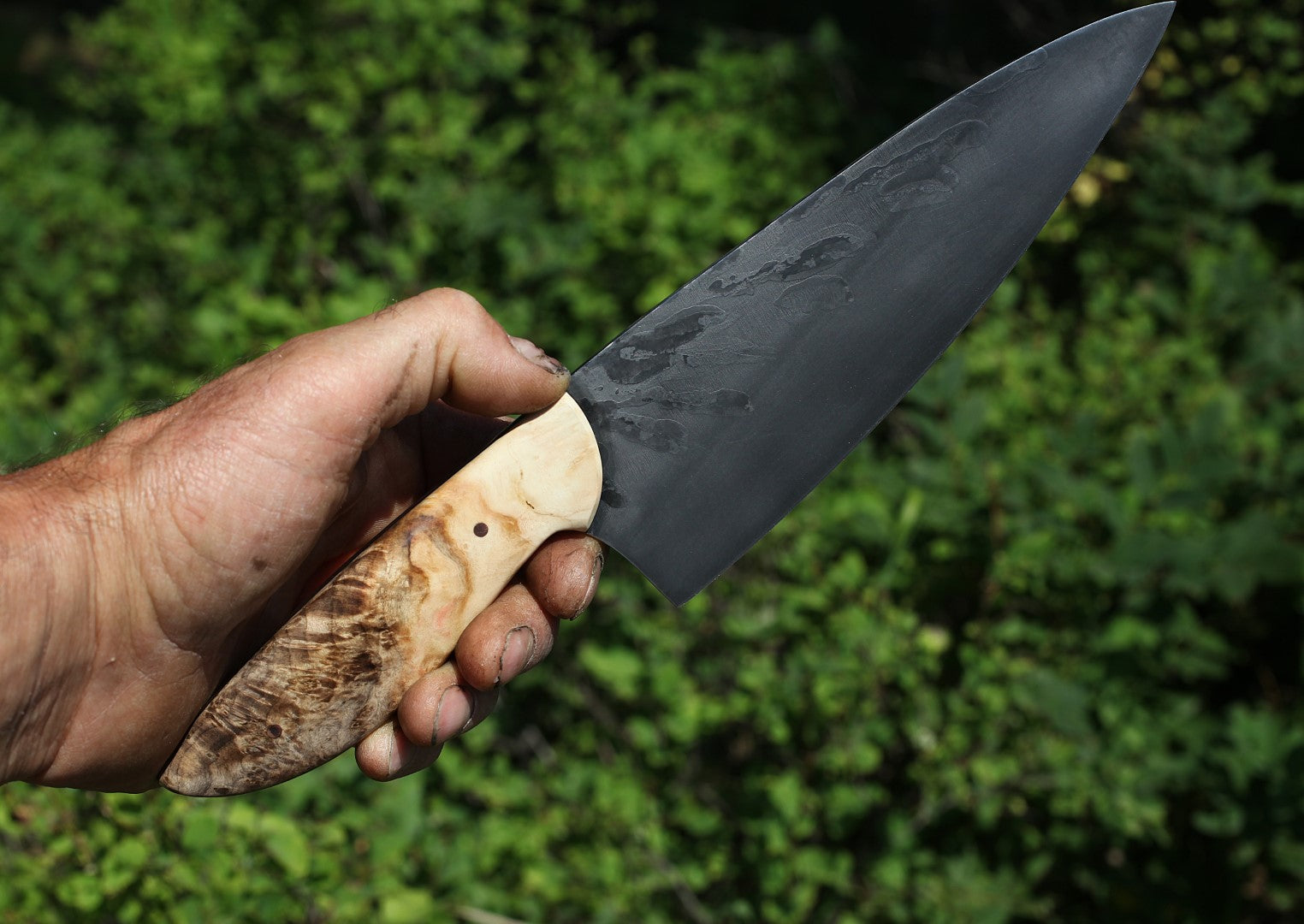 Completely handmade from 1/8 inch thick circular saw steel (8670 tool steel), recycled from a Idaho lumber mill. The special etched steel is very similar to our mothers dark colored kitchen knives that cut so well.