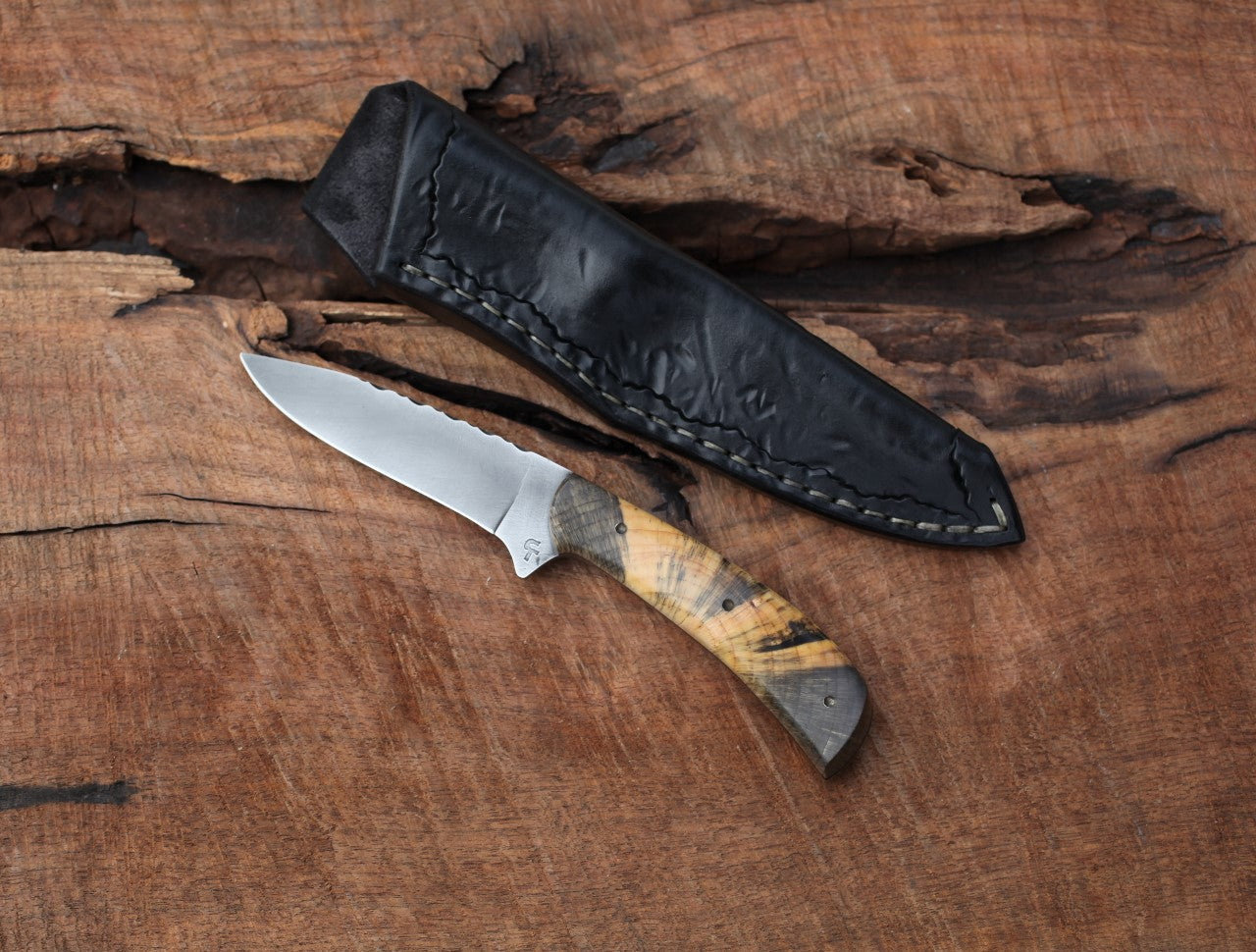 - Handle is stabilized blue stained Ponderosa pine with black liners and brass pins.