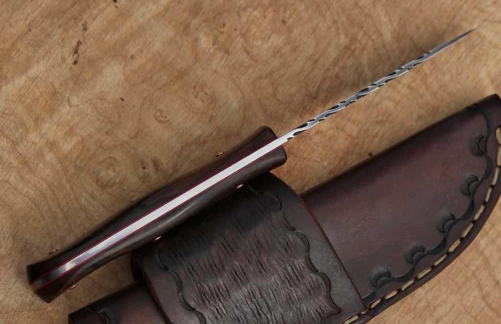 - Handle is S. American ziricote wood with red liners and peened copper pins.