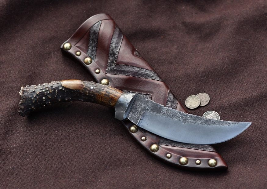 - Handle is deer antler with poured pewter and brass brads.