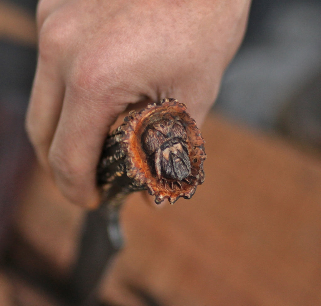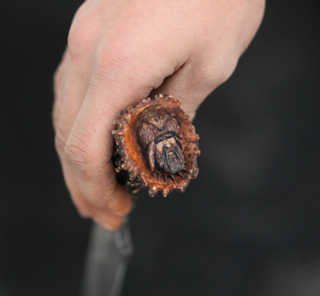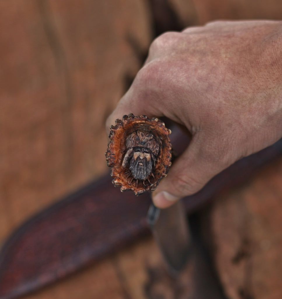 From my shop in the mountains of North Idaho, a nice one, a user made to be used or maybe a piece for the cabin mantel. The burr end is carved my Master carver Paul Carrico. Paul was known for doing some true to life ivory/antler carving back in his artist days about 15-20 years ago. This is one of kind. Mountain scene is etched into the steel.