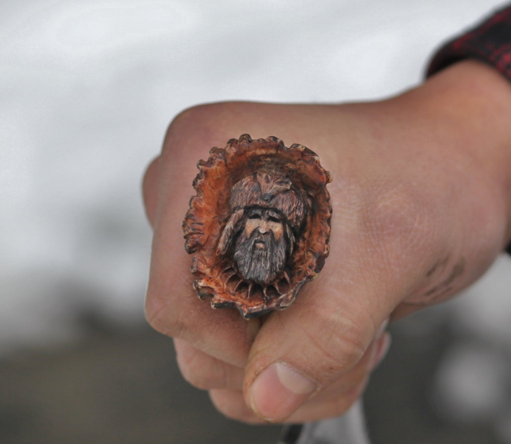 - Check out the detail, bear tooth necklace and feather on the mountain man.