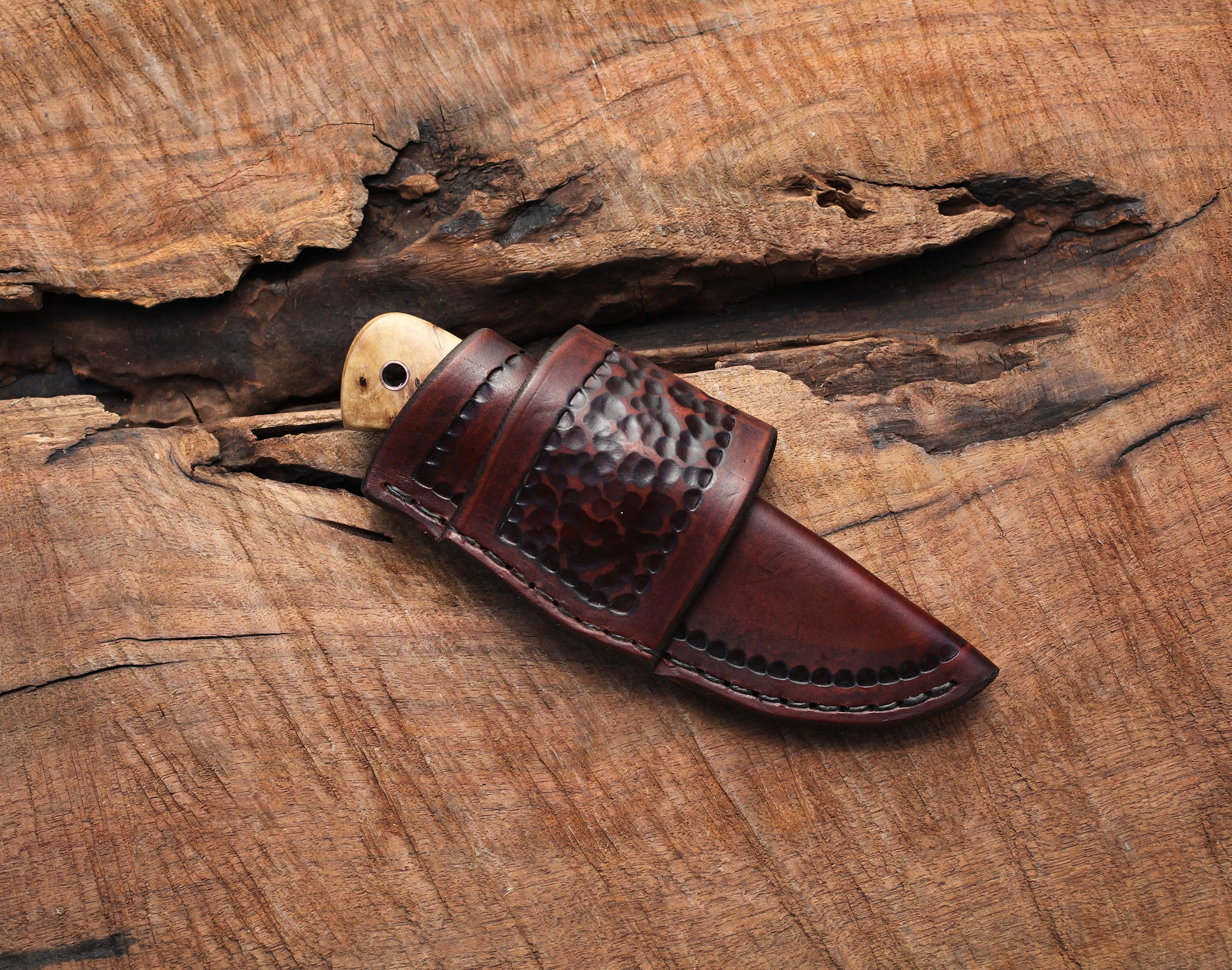 - Knife fits snugly into the custom fit leather sheath. Horizontal carry, worn on the left hip for right hand draw.