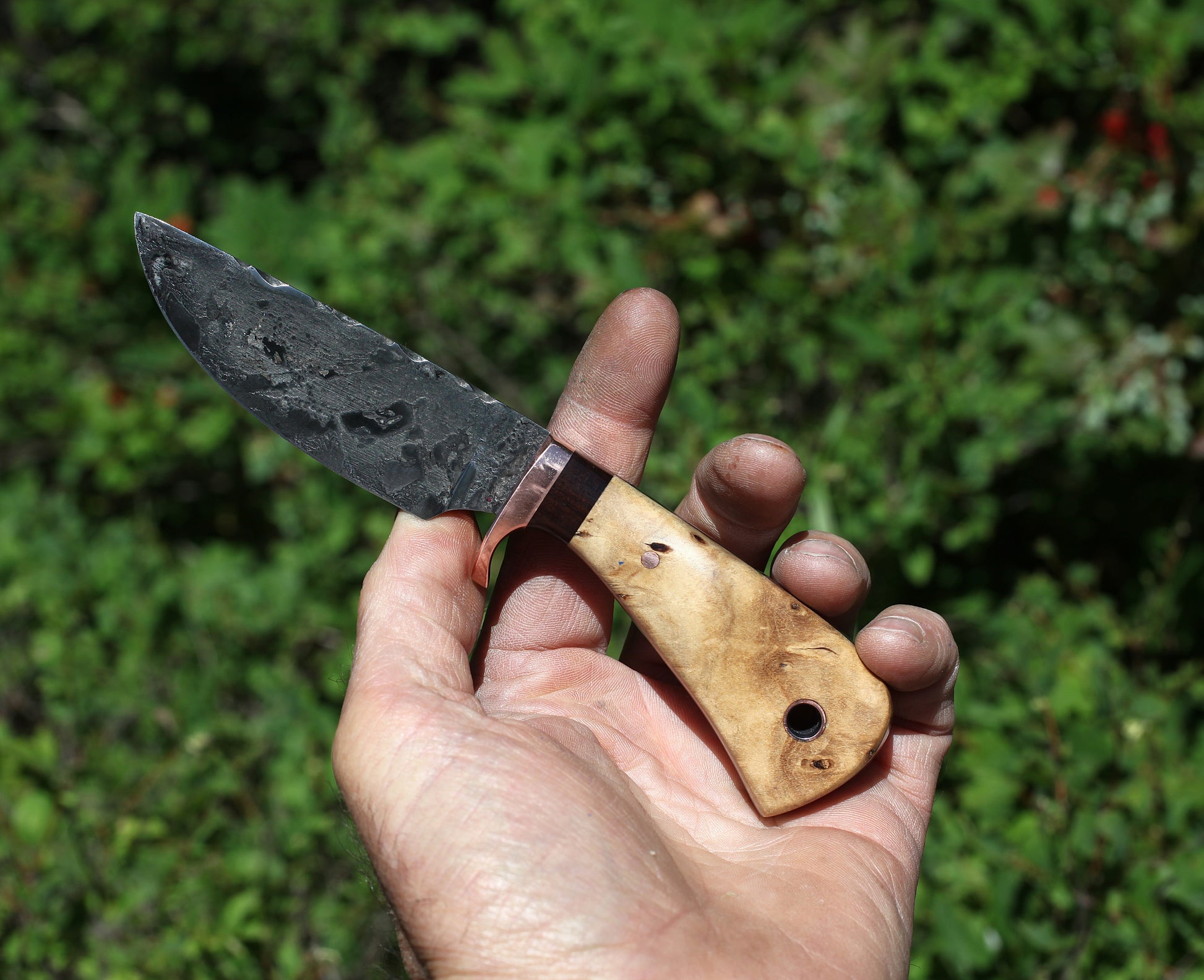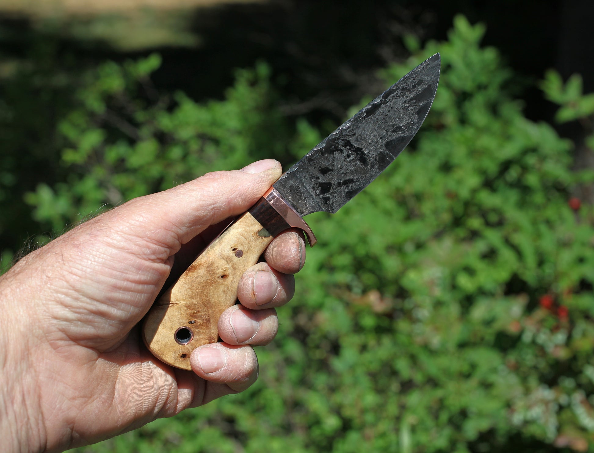 - Handle is stabilized cottonwood burl with rosewood spacer, black liners and copper fittings.