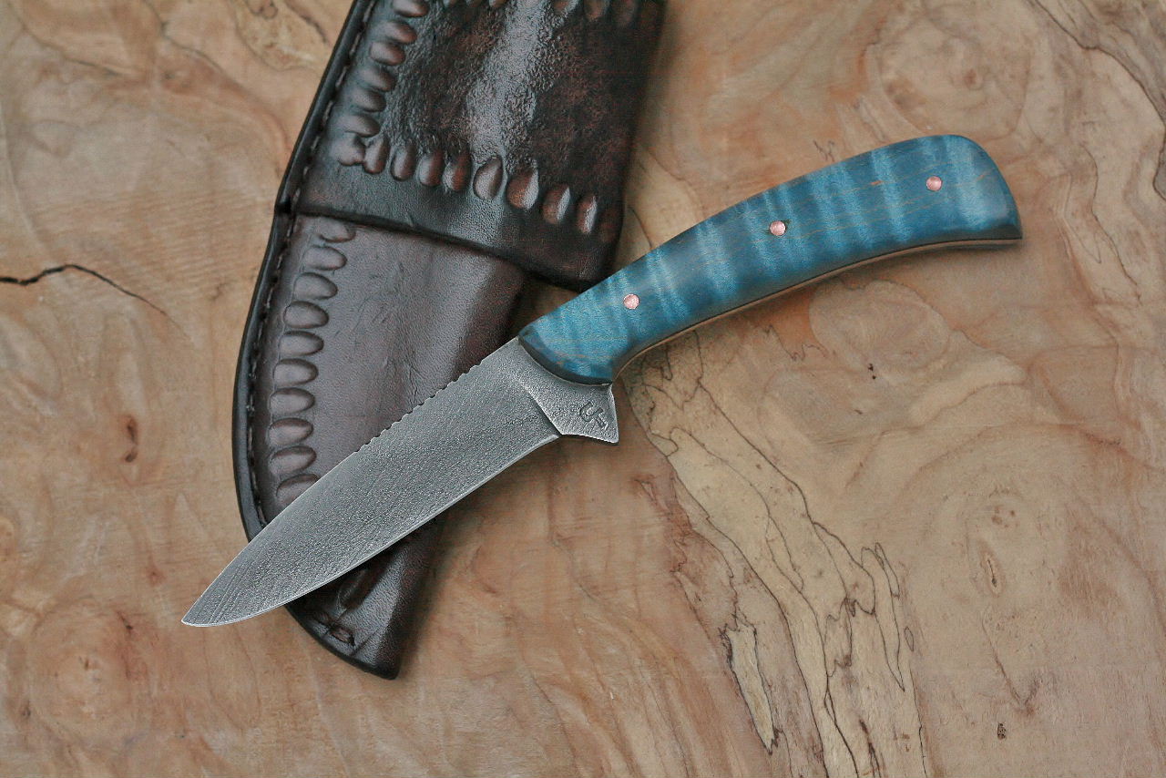 - Handle is stabilized fiddleback maple with black liners, a nice piece with copper pins