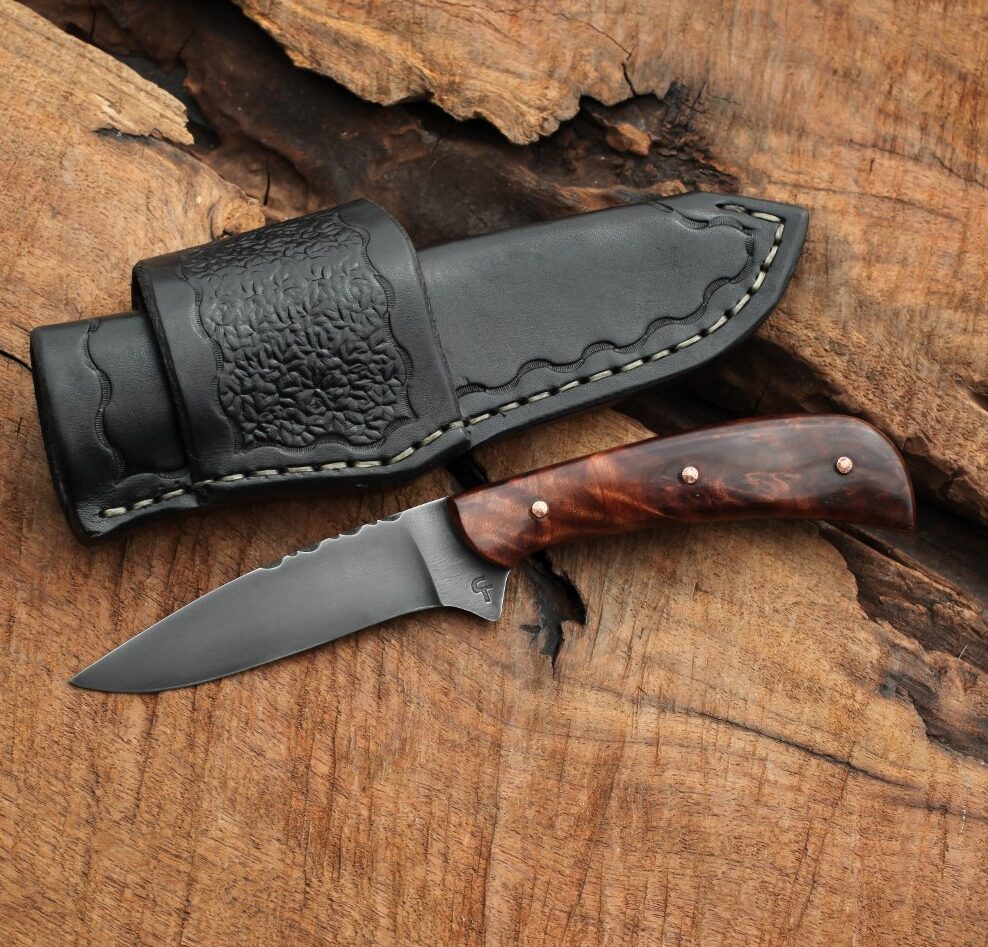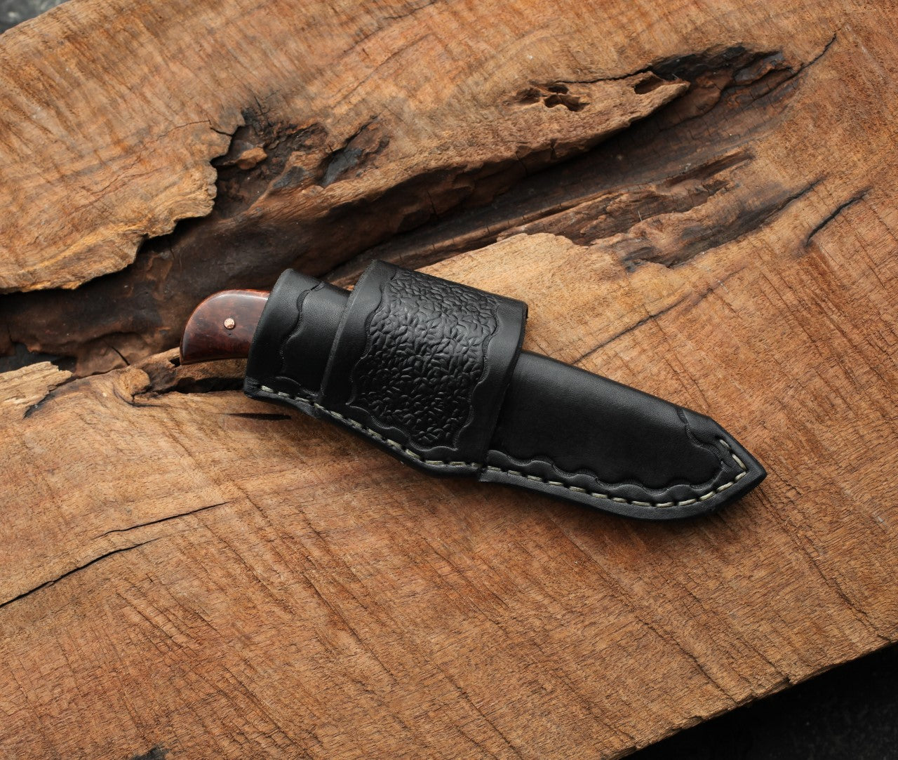 - Horizontal carry leather sheath is custom for the knife, worn on left hip for right hand draw.