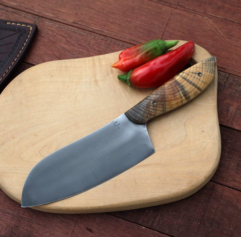 Eye catching handle and completely handmade from 1/8 inch thick circular saw steel (8670 tool steel), recycled from a defunct North Idaho lumber mill. The steel is very similar to our mothers dark colored kitchen knives that cut so well. Custom tooled leather sheath