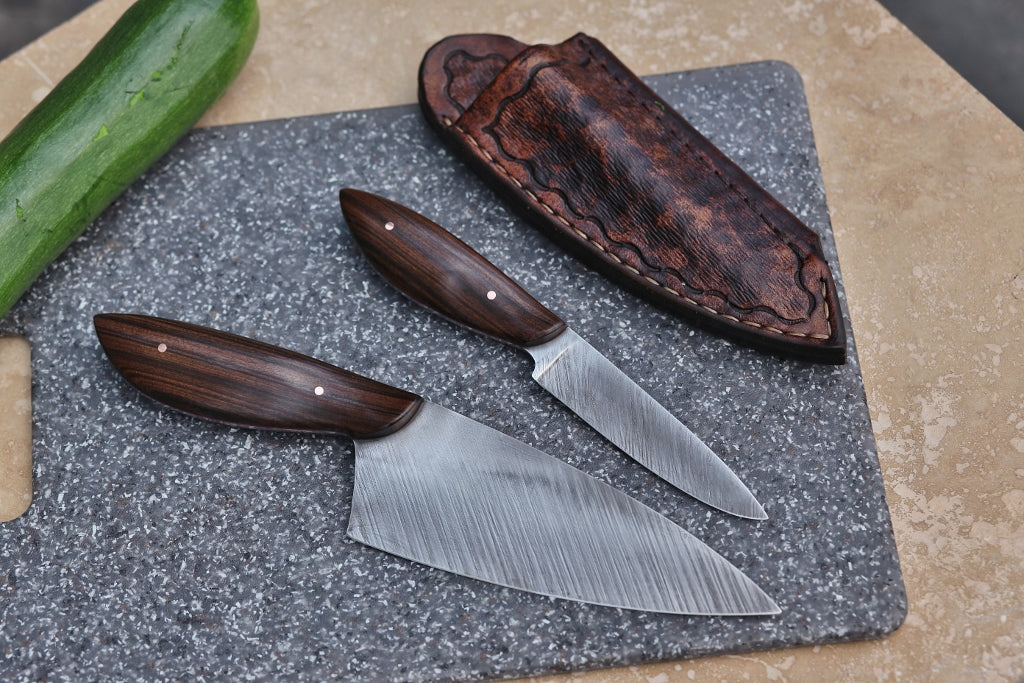 - Sheath is 10-12oz. weight leather, tooled and custom for this set. Includes sharpening strop, see Sharpening on my Knife Care page.