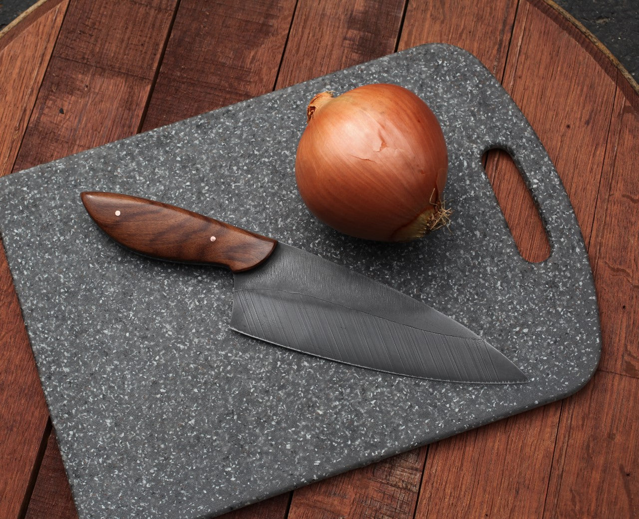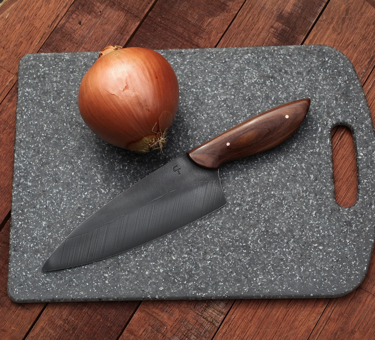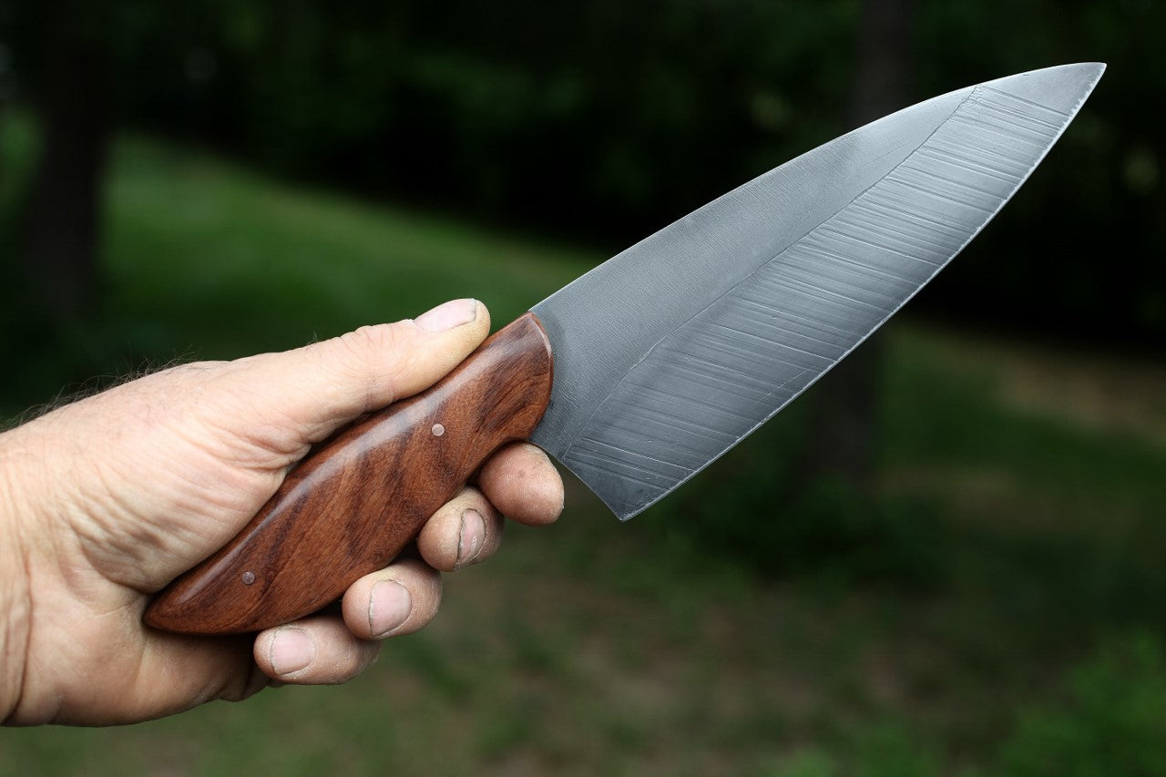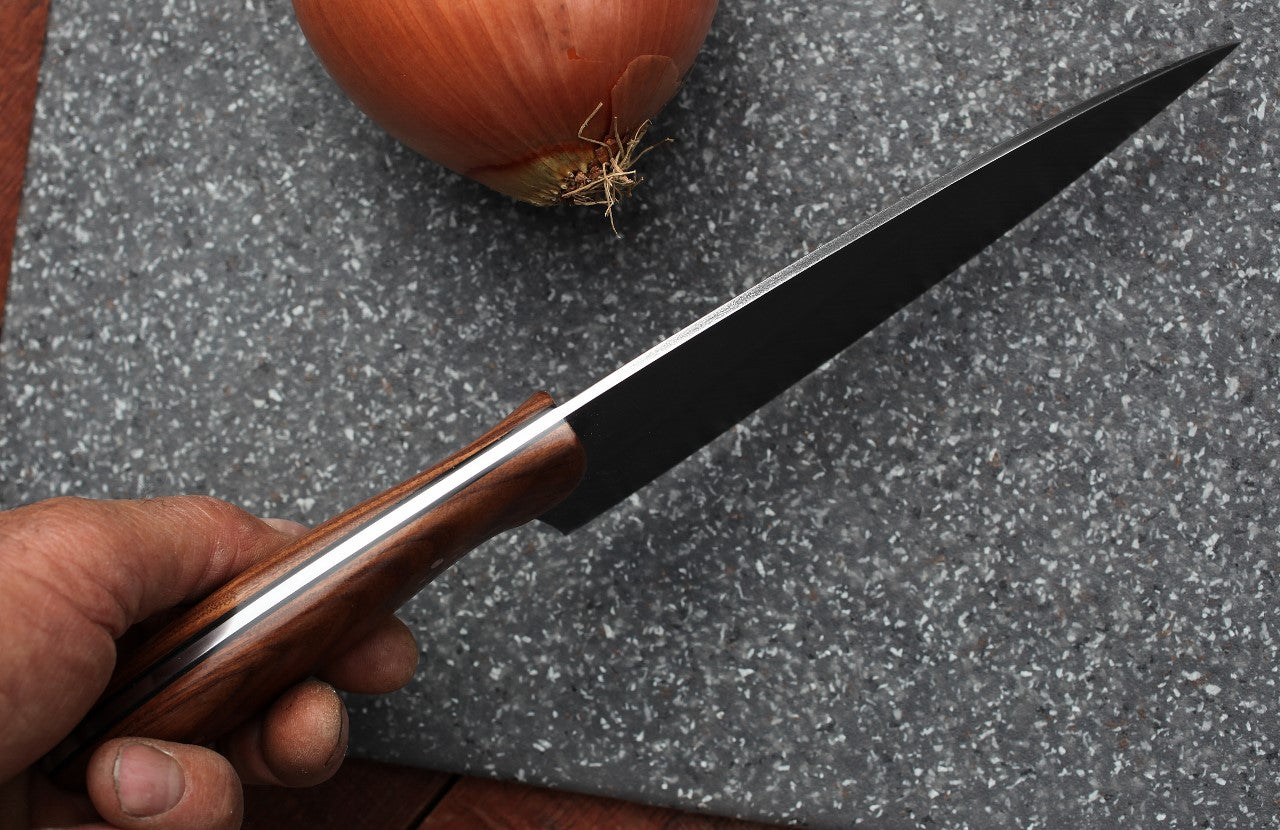- Crafted from industrial saw blade steel, very similar to our mom’s dark colored carbon steel knives that always worked so well.