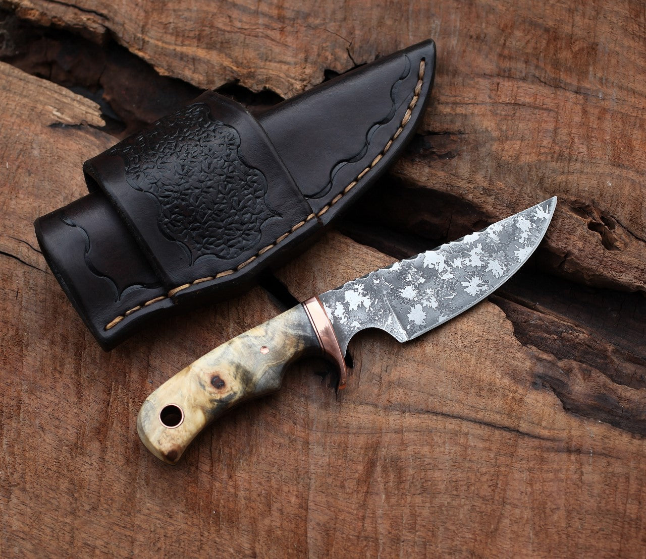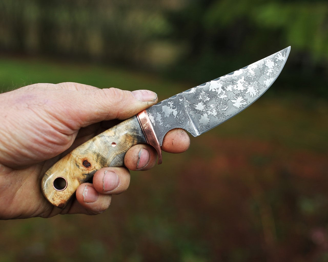 Handmade from 1/8th thick industrial circular saw steel, recycled from a now defunct North Idaho lumber mill. Etched tool steel (8670, similar to L6 ) is oil heat treated and tempered making a razor sharp edge that is easy to resharpen with the strop provided. Finger groove to choke up on allows for a bigger blade in a smaller package. Slightly upswept blade works well for everything, its the blade shape I carry.