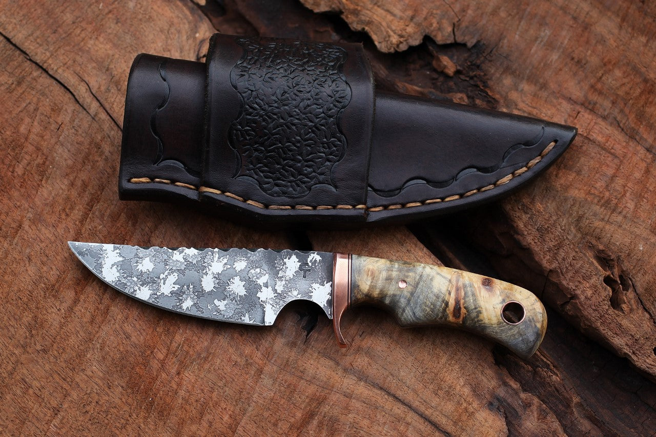 - Handle is stabilized buckeye burl ( nice handle with lots of character) with black liners and copper fittings.