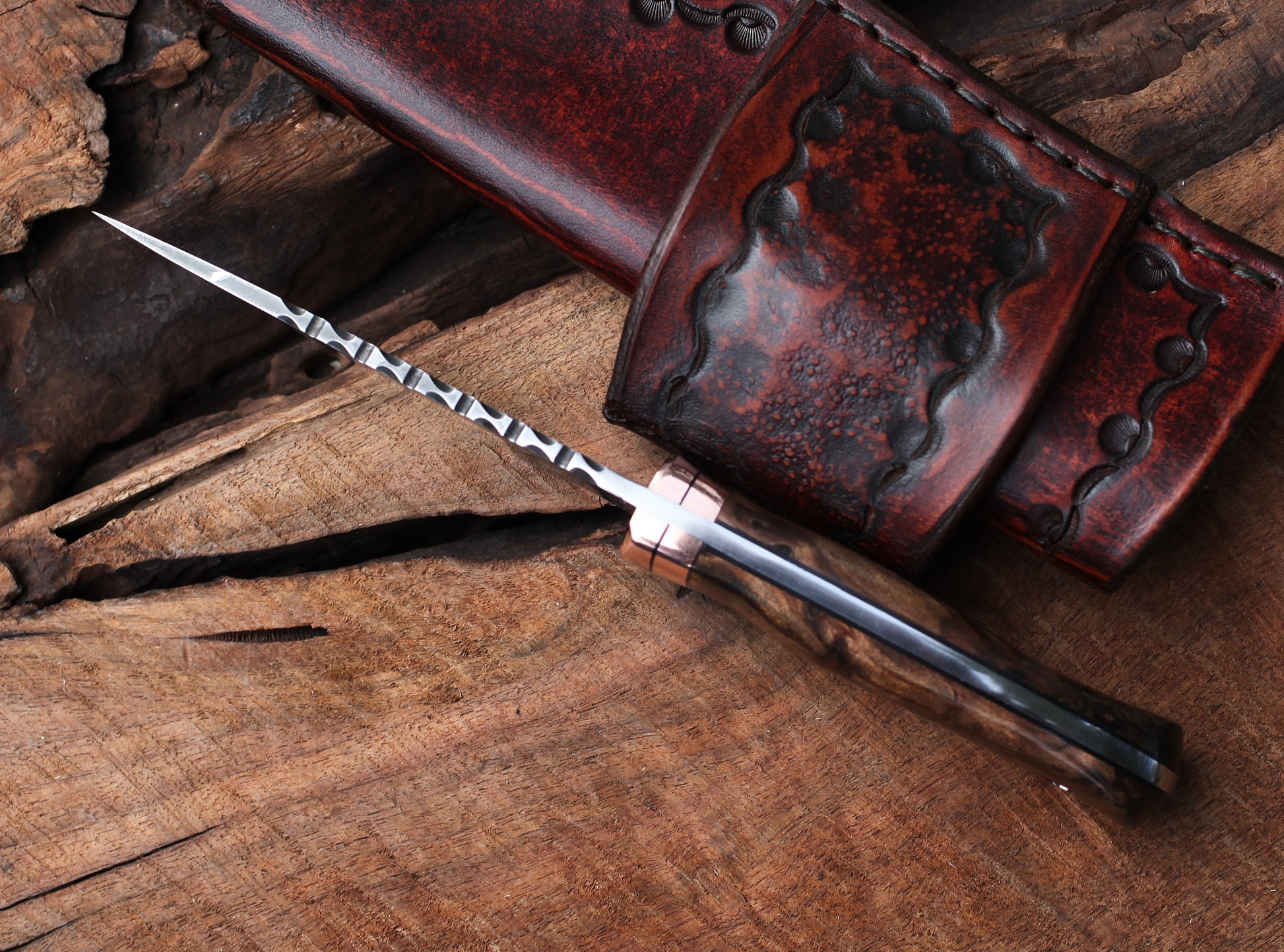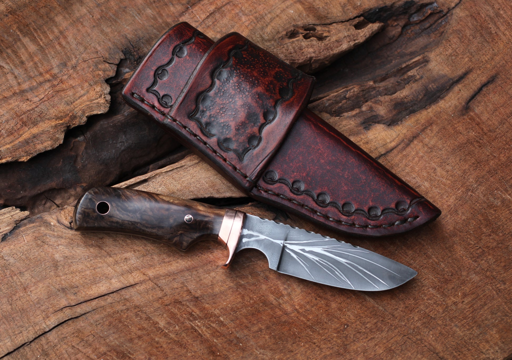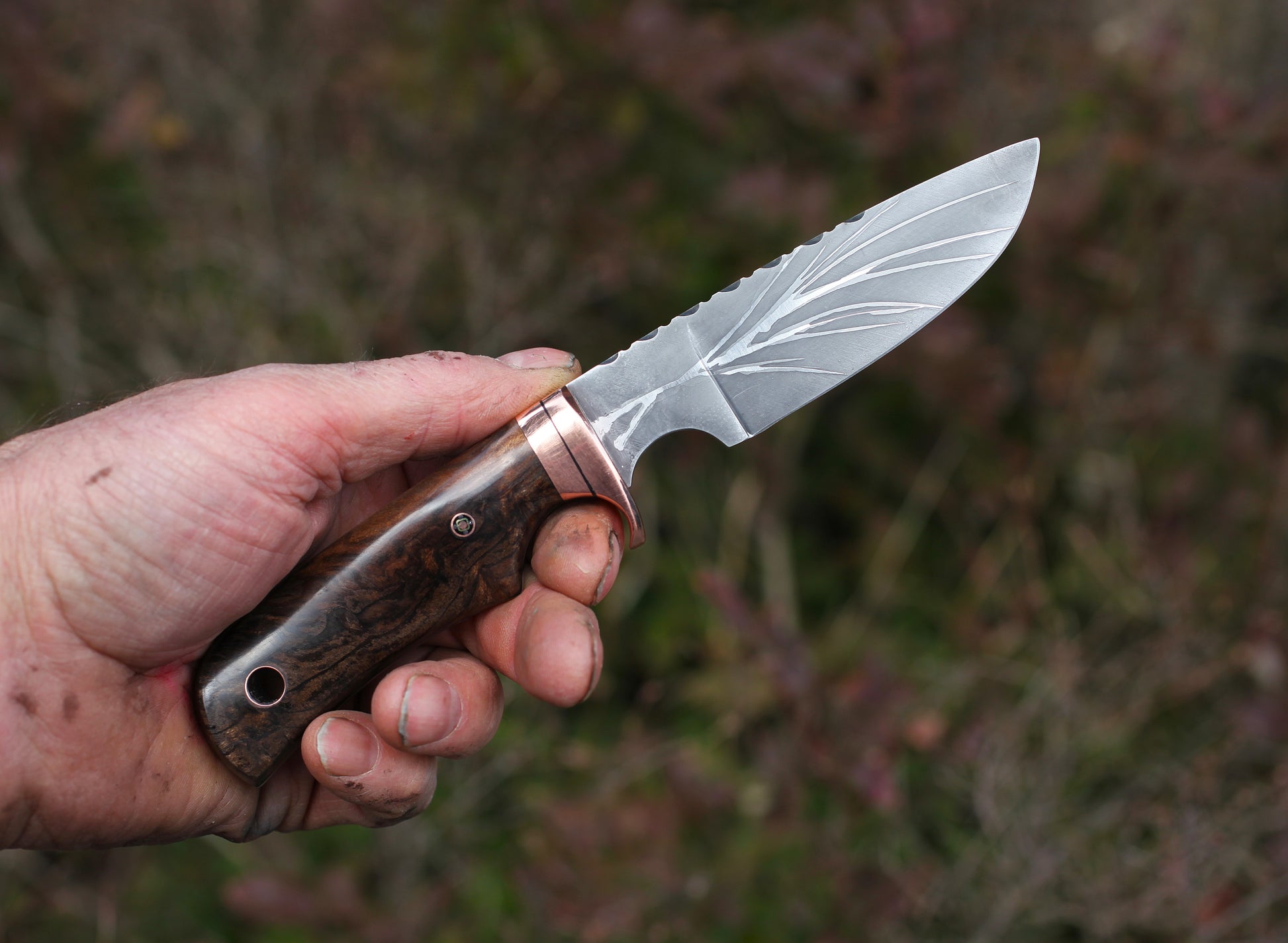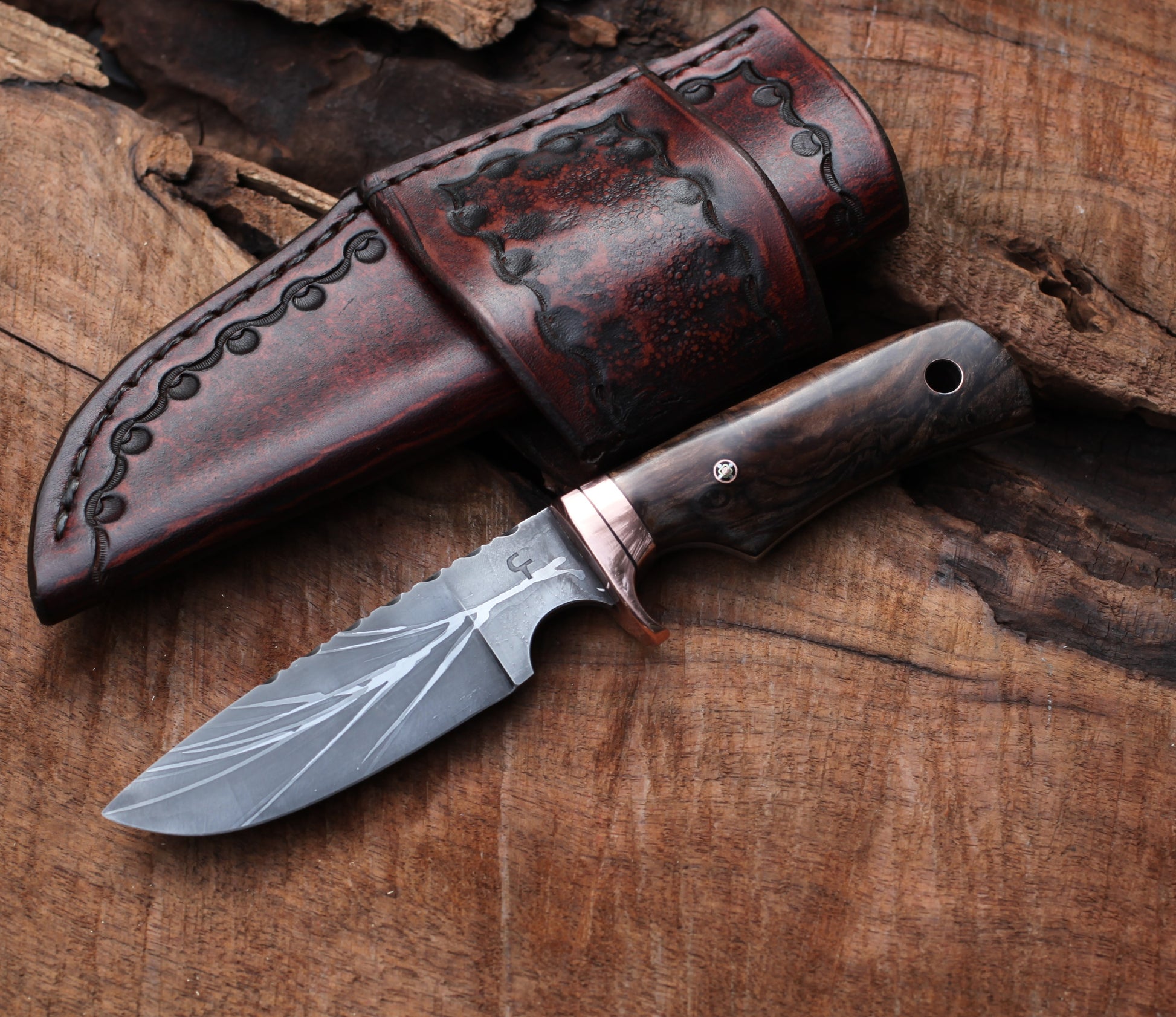 From my shop in the mountains of North Idaho: Crafted from recycled circular saw steel a little more than 1/8 inch thick, from a defunct Idaho wood mill. Reground, oil heat treated, tempered and custom etched makes for a nice looking hunting or utility blade. A naturally colorful piece figured redwood burl. Copper fittings and mosaic pin. Etched 8670 tool steel.