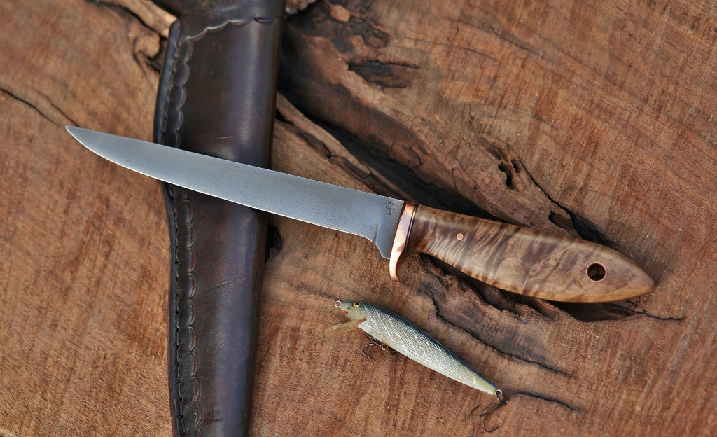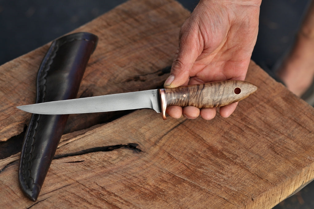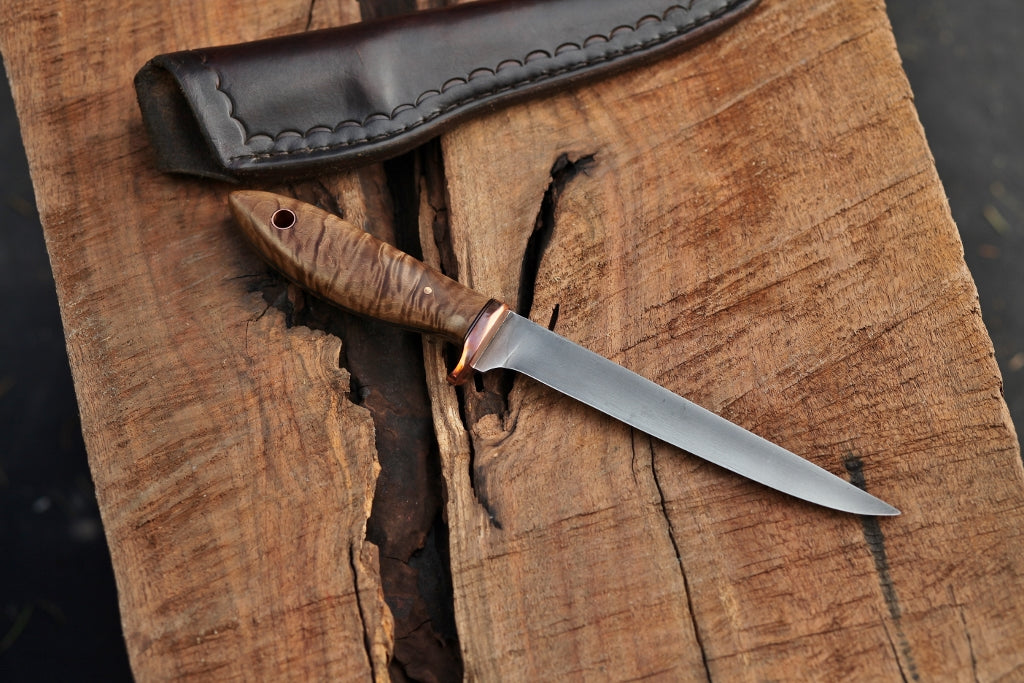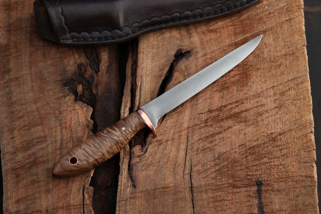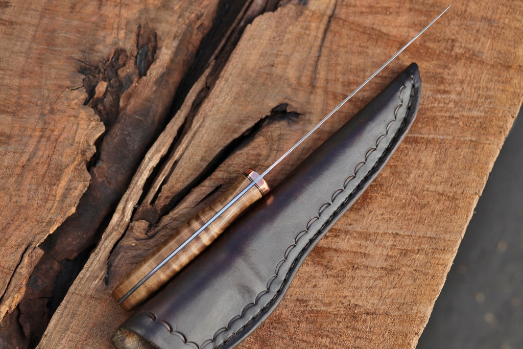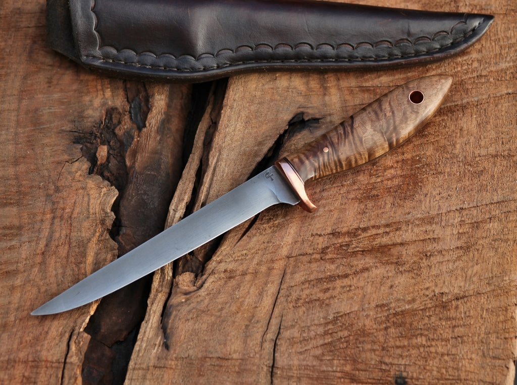 •Over all length is 11.75 inches, blade is just under 6.75 inches. The handle material is stabilized figured maple, copper fittings with black liners.