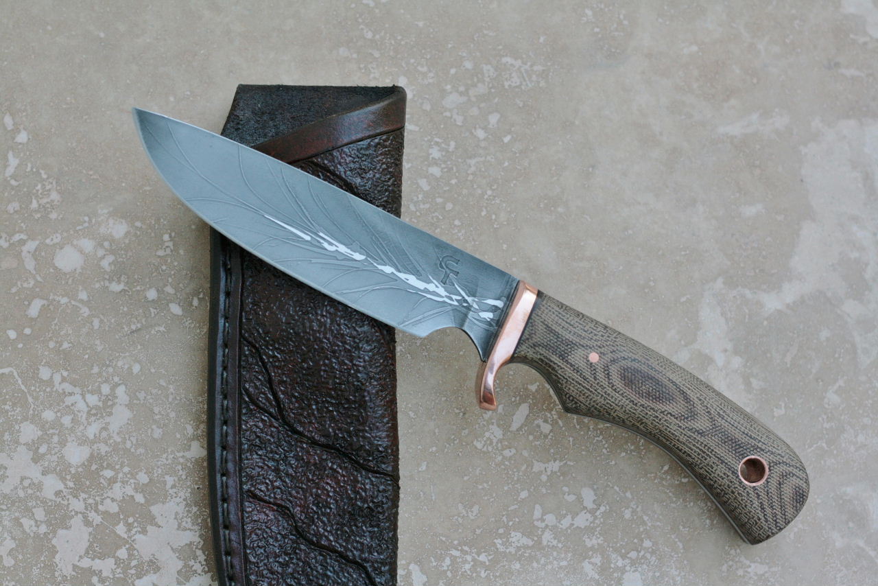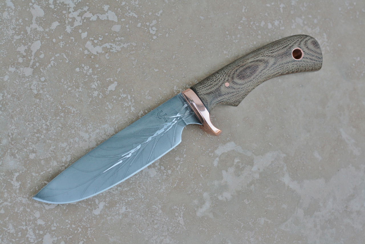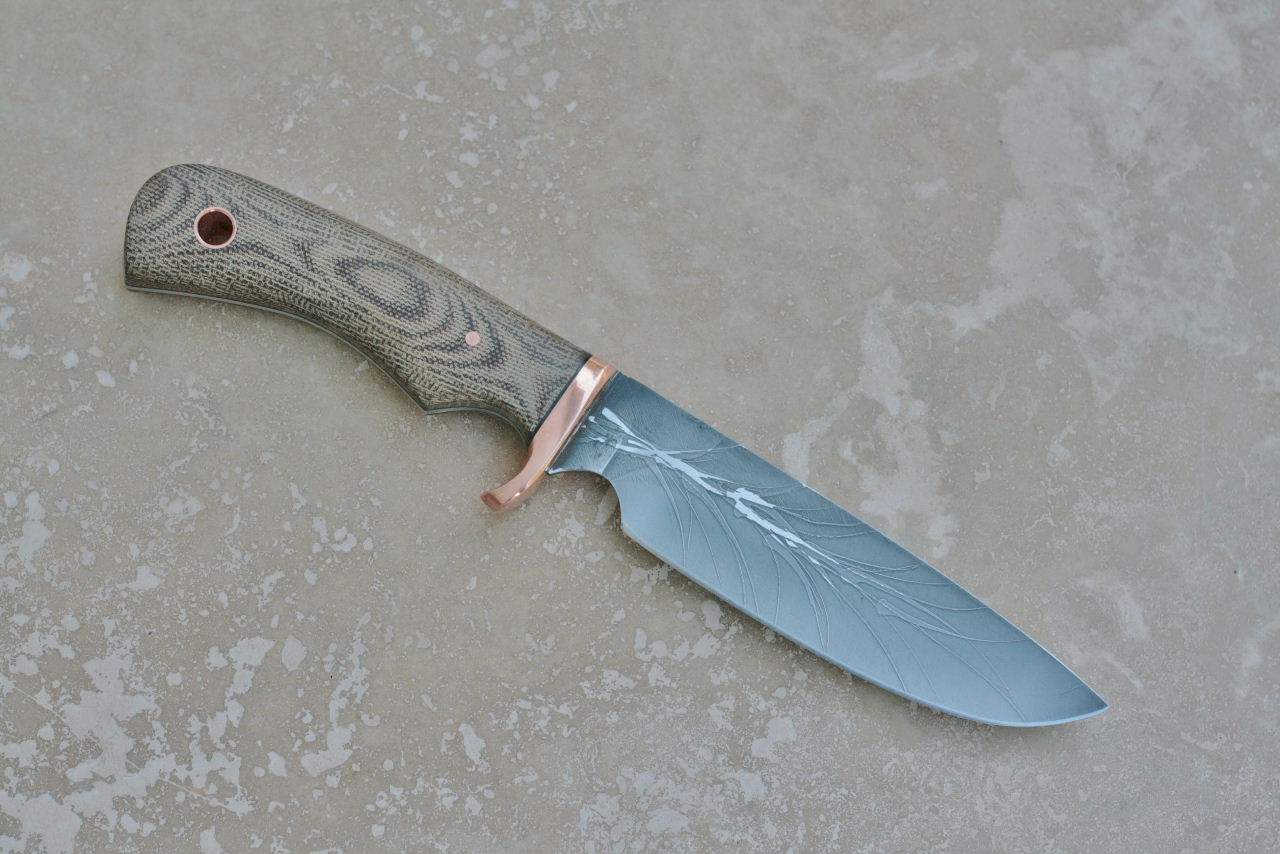 - Handle is canvas micarta. Fittings are copper with black liners.
