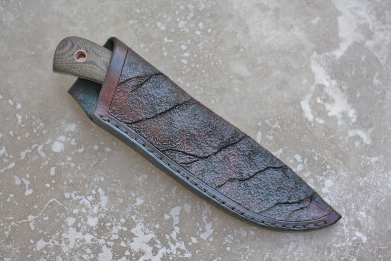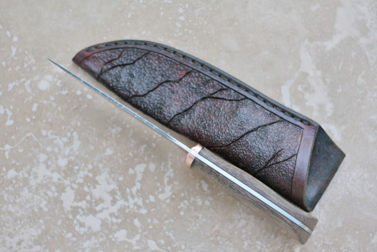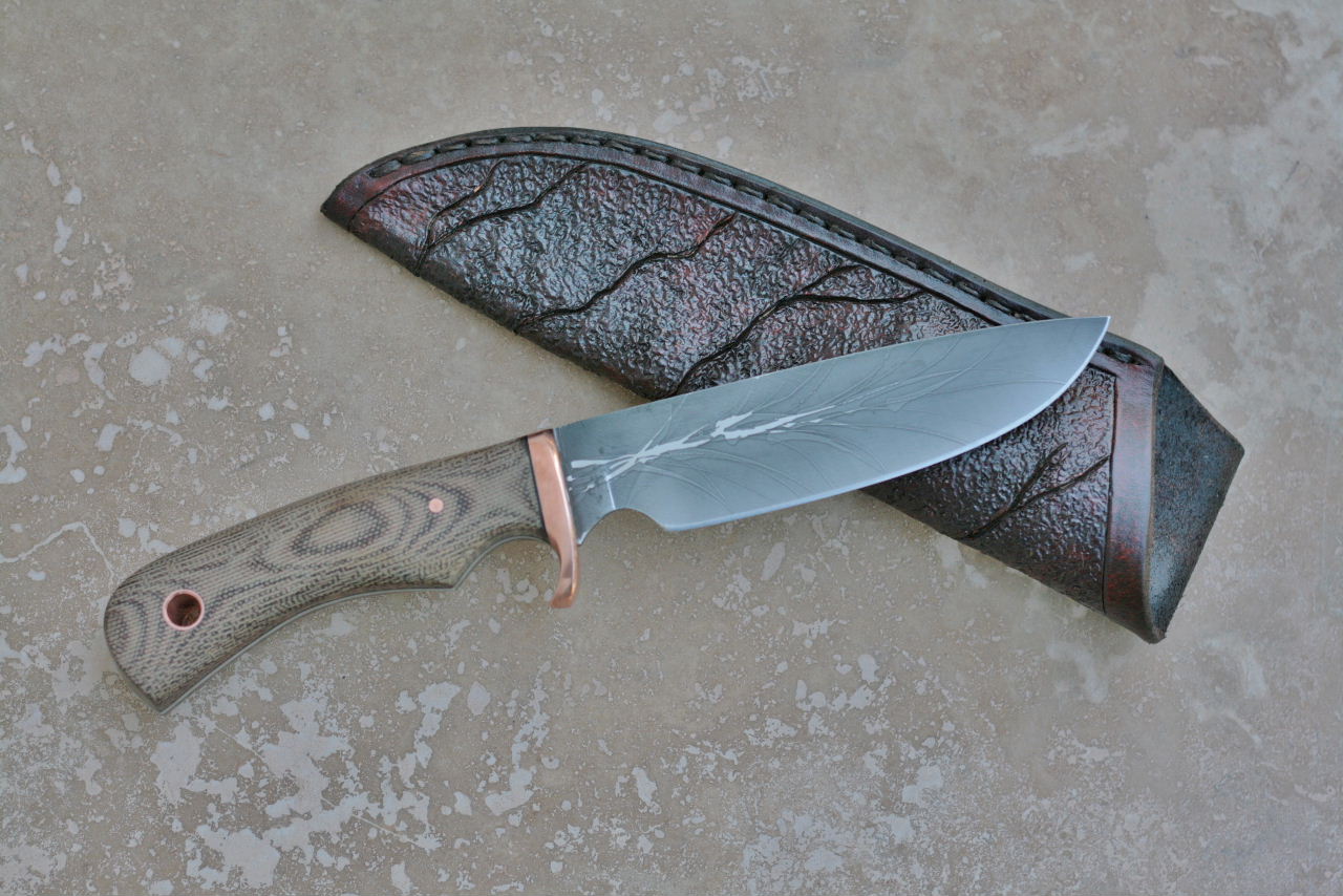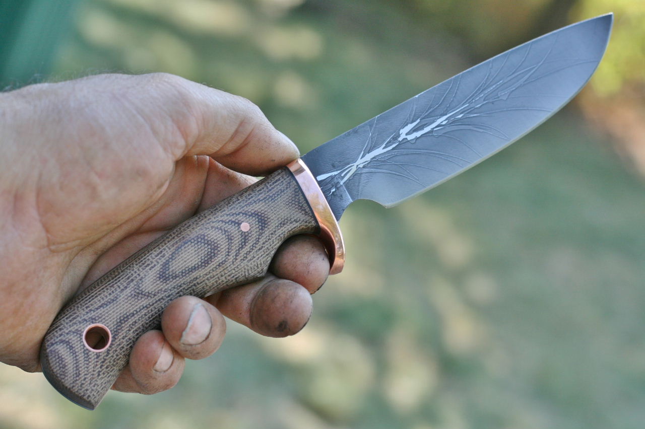 - Handle is canvas micarta. Fittings are copper with black liners.