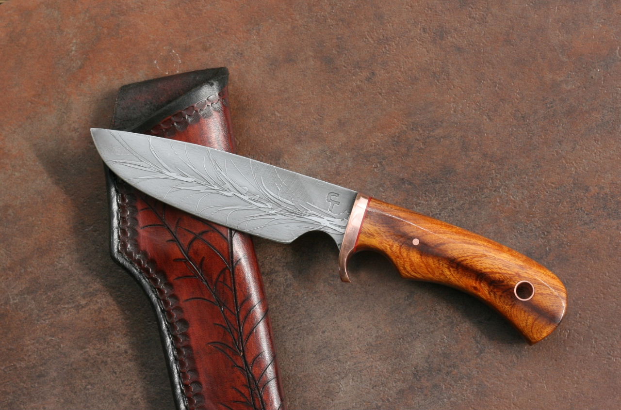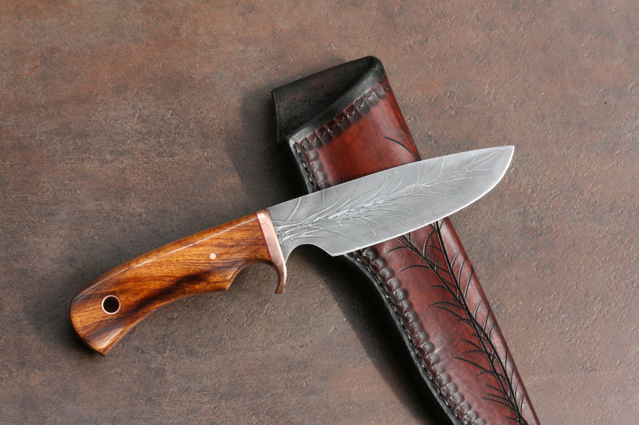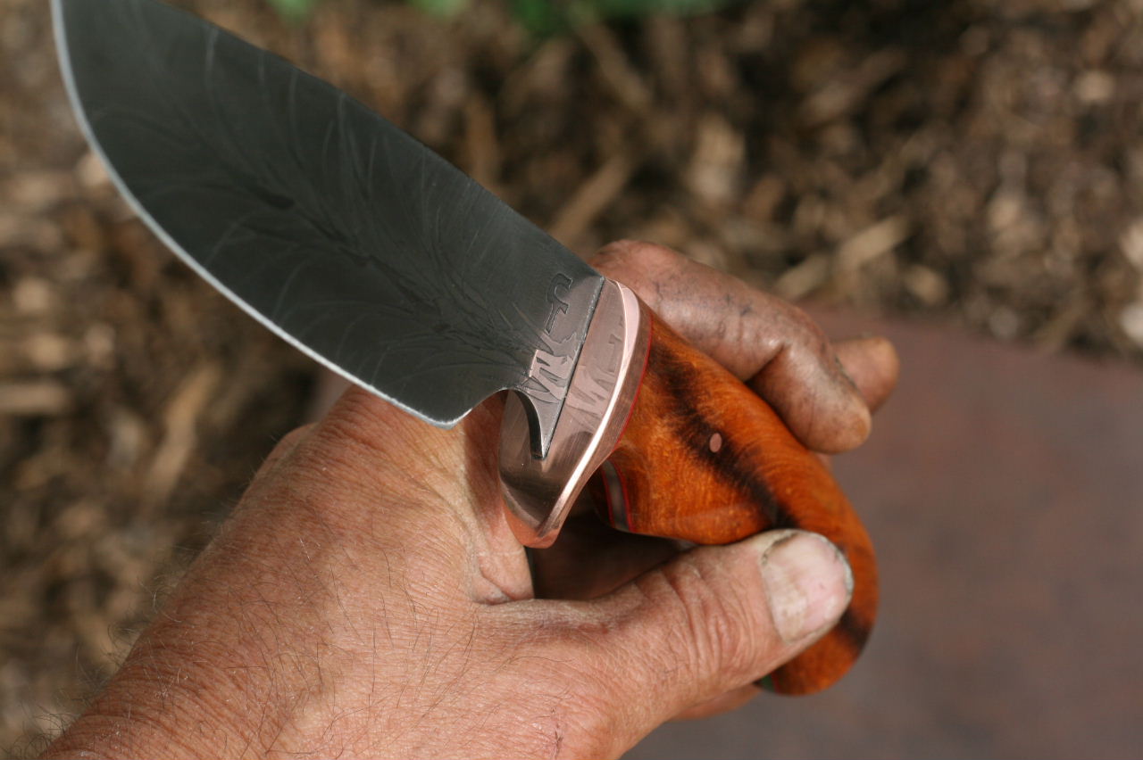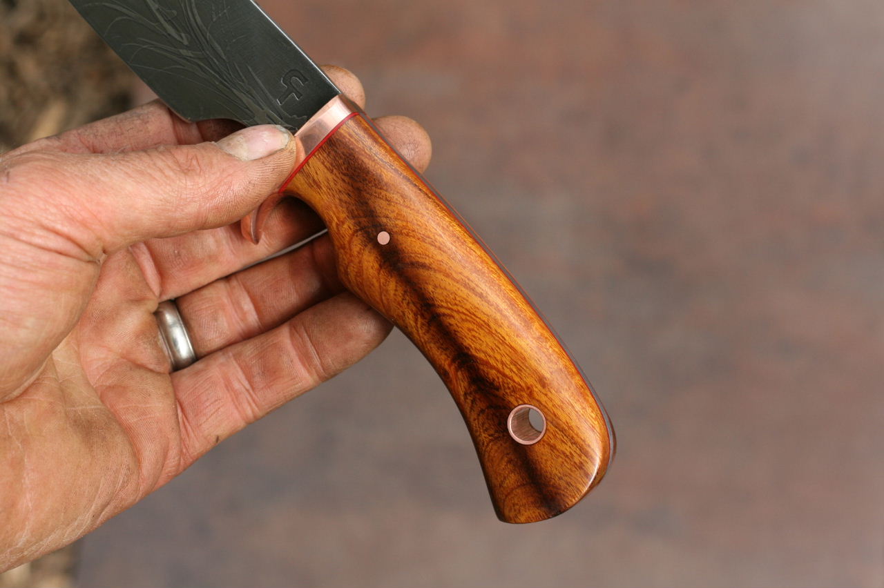 - Handle is Arizona Ironwood, hard and heavy, tough wood. This piece came from an old homestead fence post, quite old. a solid piece with some beautiful color. Fittings are copper with red liners.