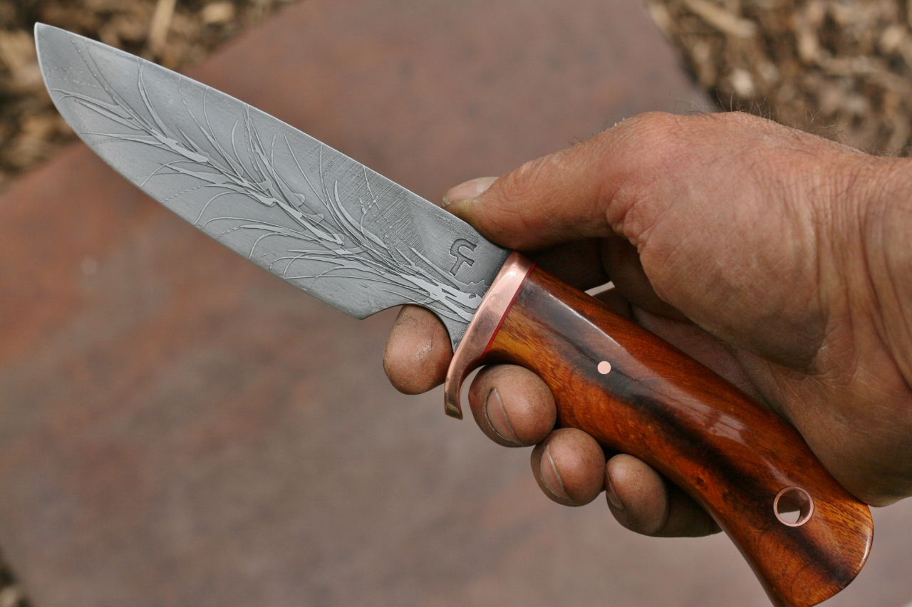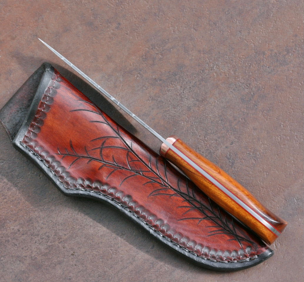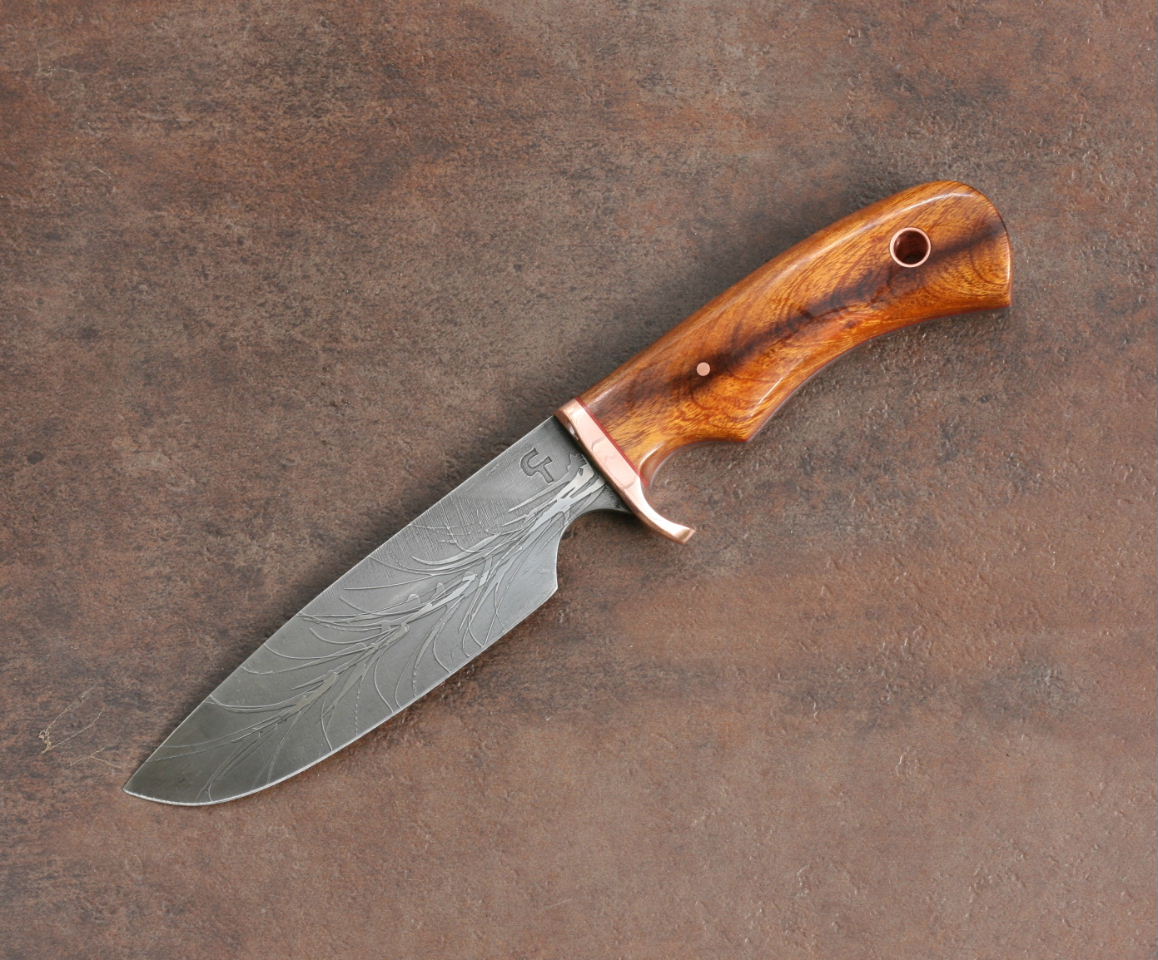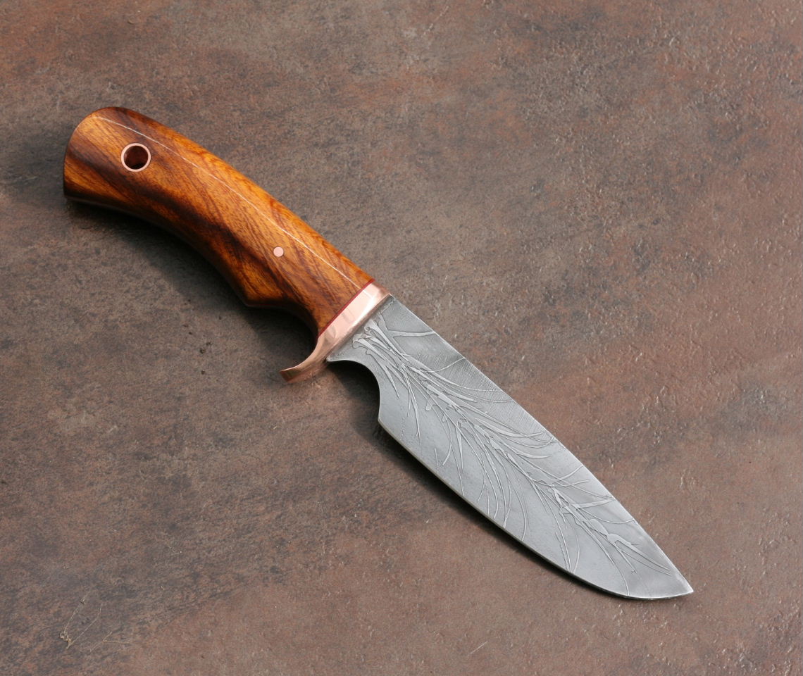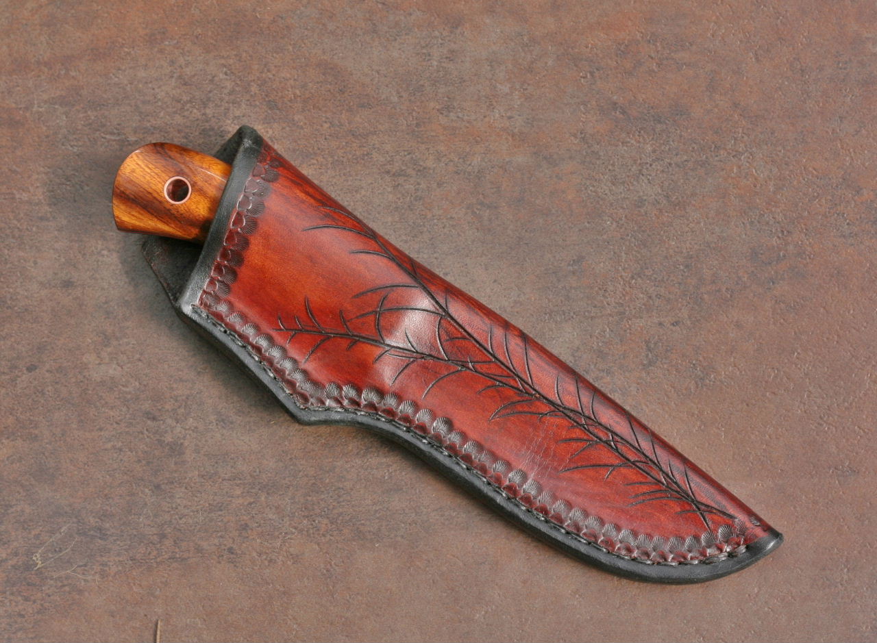 - Handle is Arizona Ironwood, hard and heavy, tough wood. This piece came from an old homestead fence post, quite old. a solid piece with some beautiful color. Fittings are copper with red liners.