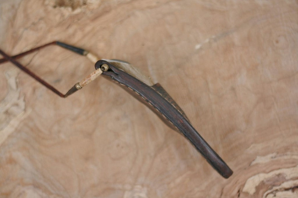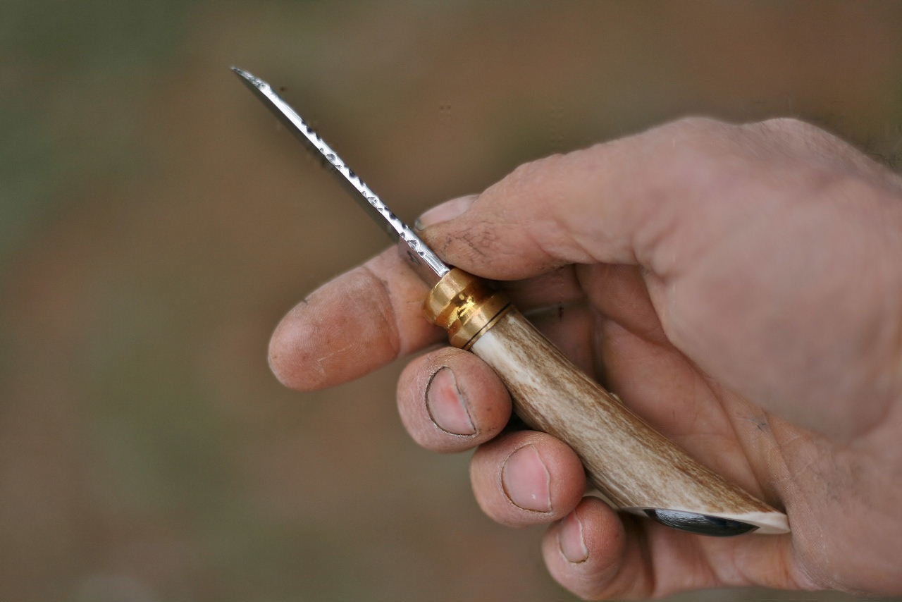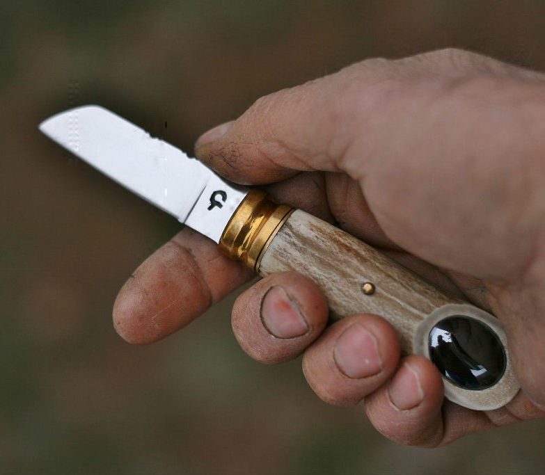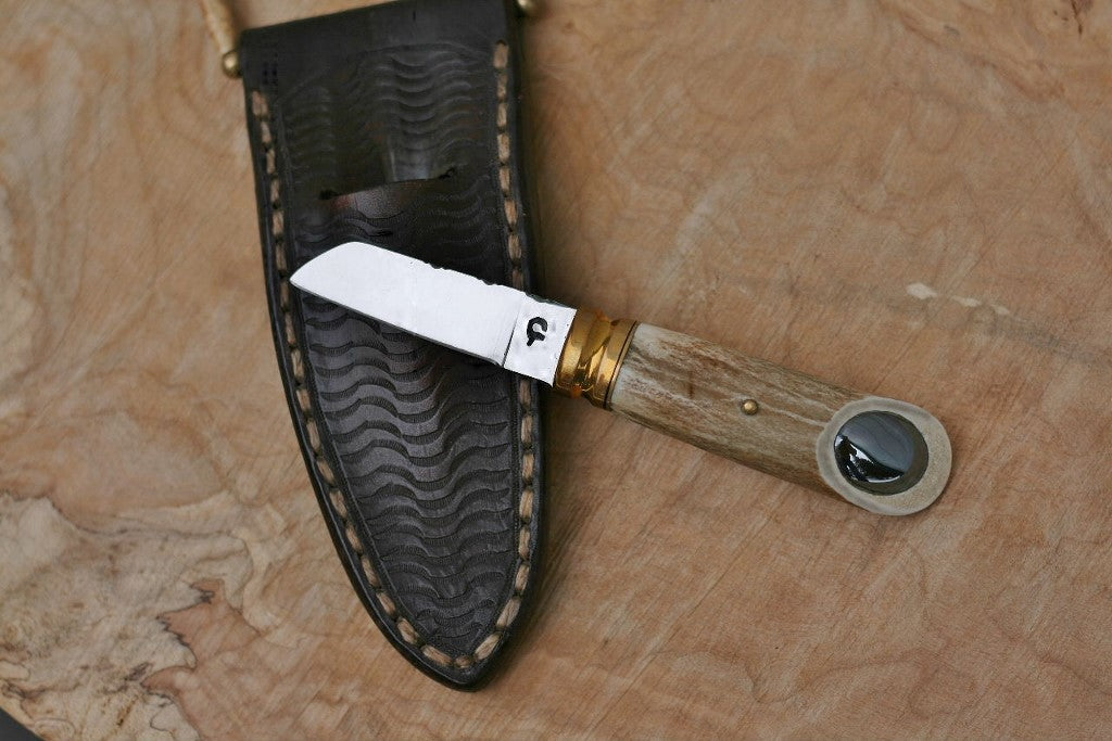 A nice little utility/patch knife from whitetail antler. A hematite stone is inlet into the handle, brass guard.