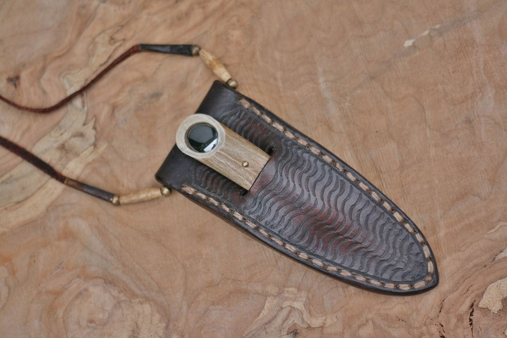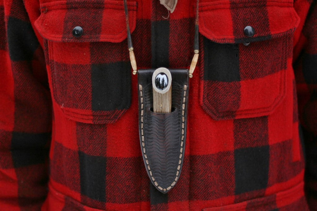 Keywords; patch knife, utility, necker, polished 15N20 carbon steel, cf, stone cab, custom carved leather