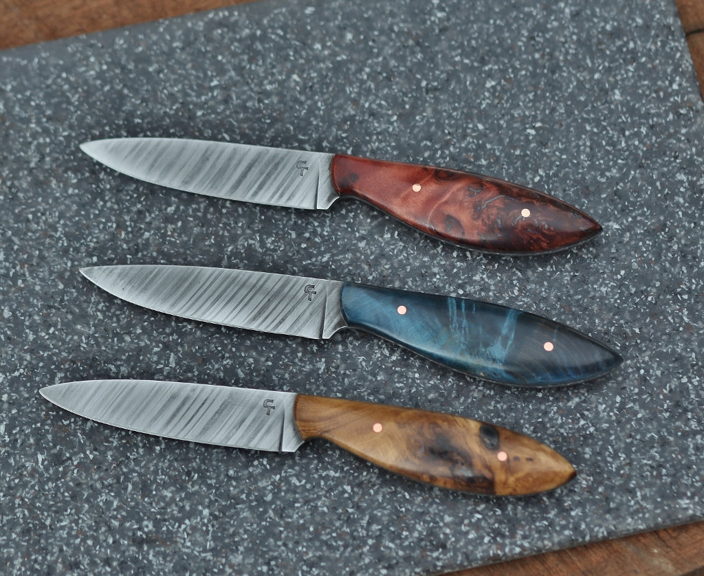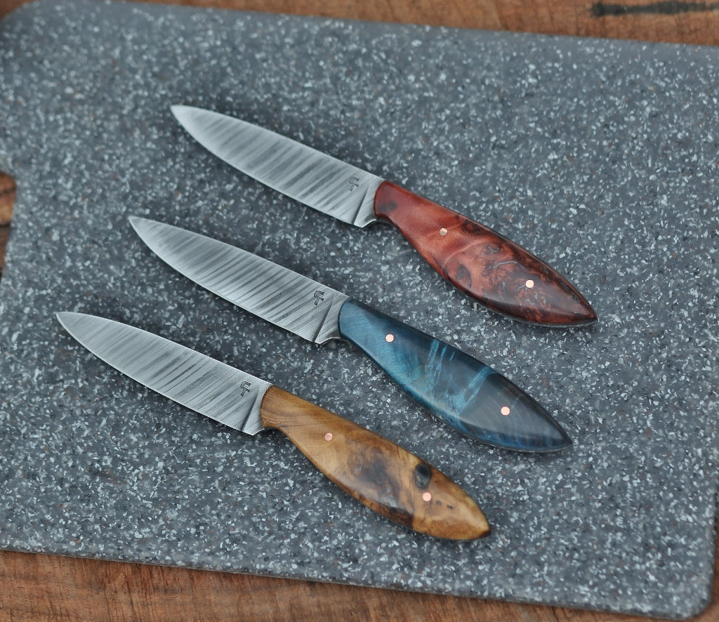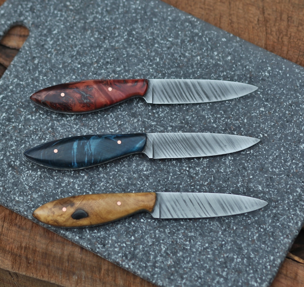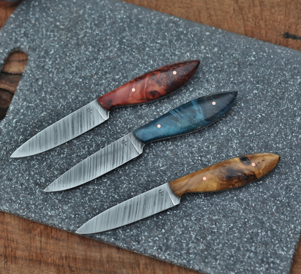 All 3 are 8.25 inches long, 3.75 inch cutting edges. Crafted from recycled Idaho lumber mill saw steel, 8670 carbon tool steel is easy to sharpen, see the short sharpening video on my "Knife Care" page.