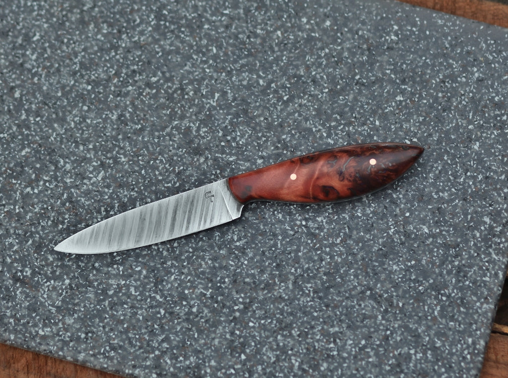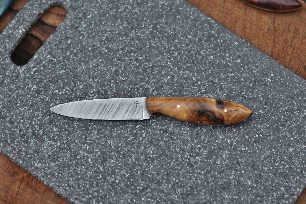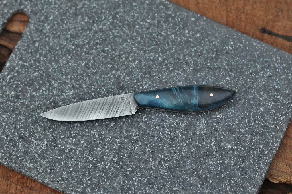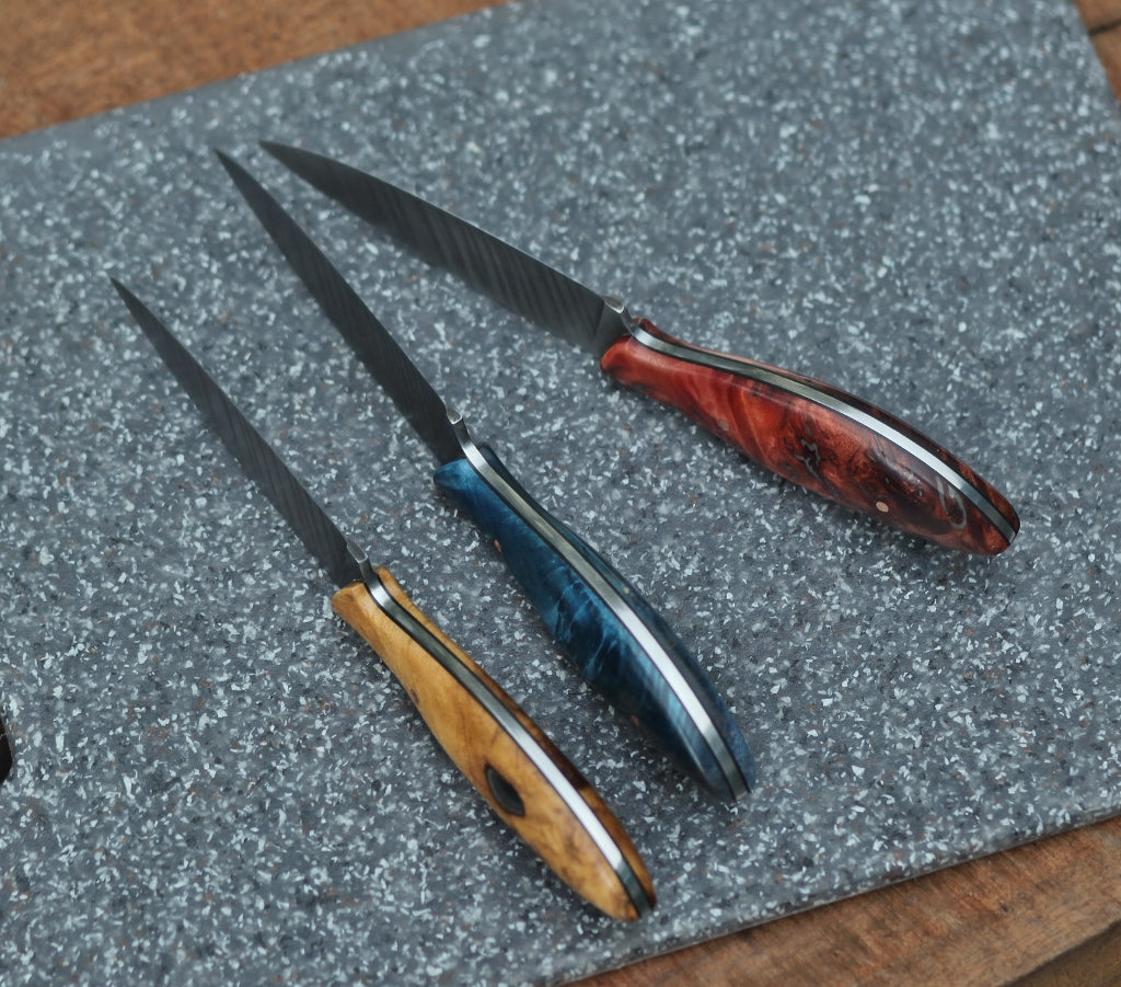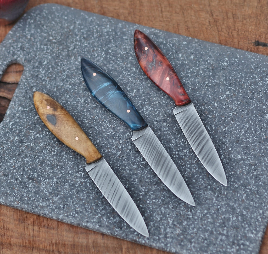 All 3 are 8.25 inches long, 3.75 inch cutting edges. Crafted from recycled Idaho lumber mill saw steel, 8670 carbon tool steel is easy to sharpen, see the short sharpening video on my "Knife Care" page.
