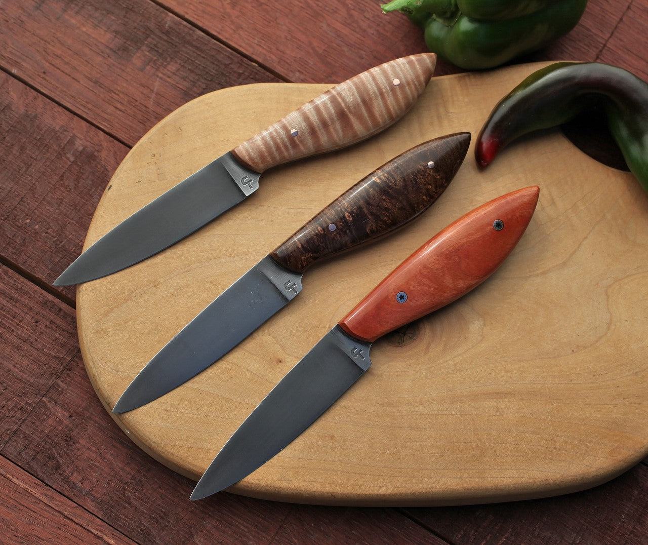 Just finished. Your choice on these nice paring blades. All 3 are approx. 8.25 inches long, 3.75 inch cutting edges. Crafted from recycled Idaho lumber mill saw steel, 8670 carbon tool steel is easy to sharpen, see the short sharpening video on my "Knife Care" page. From the top: