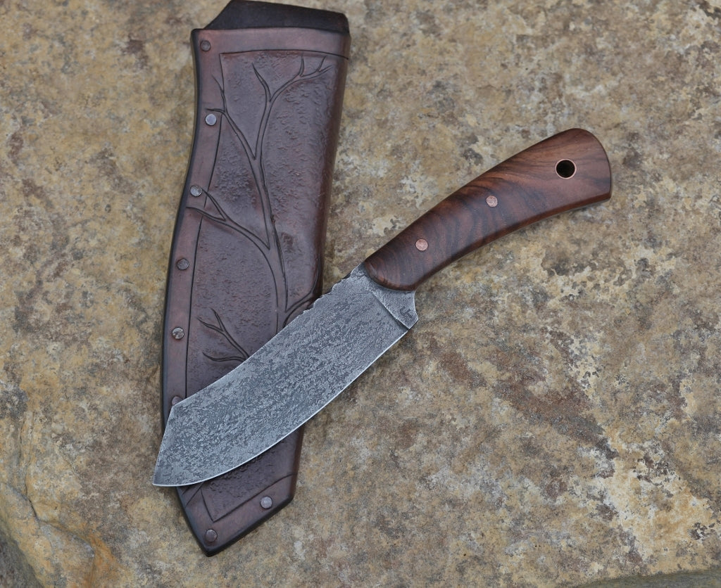 I recycled this steel from a old lumber mill in southern Oregon 40 + years old, 3/16th thick lumber mill circular saw steel (8670), similar to L6 carbon tool steel. Reground, oil heat treated and tempered and acid etched. Feels right in the hand.