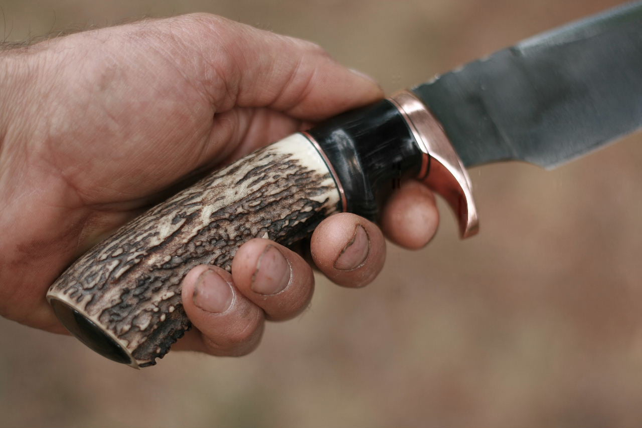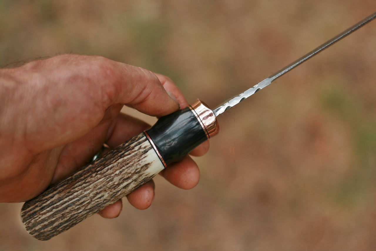 One of kind, from my shop in the mountains of North Idaho. Old lumber mill saw steel is reborn. Reground, oil heat treated and etched A nice Idaho elk tine is matched up with African blesbok horn and copper. Inset in the butt of the knife is a nice Jasper cab. A natural finger groove from the horn and coarse texture from the antler gives this fighter a good grip and feels good in the hand.