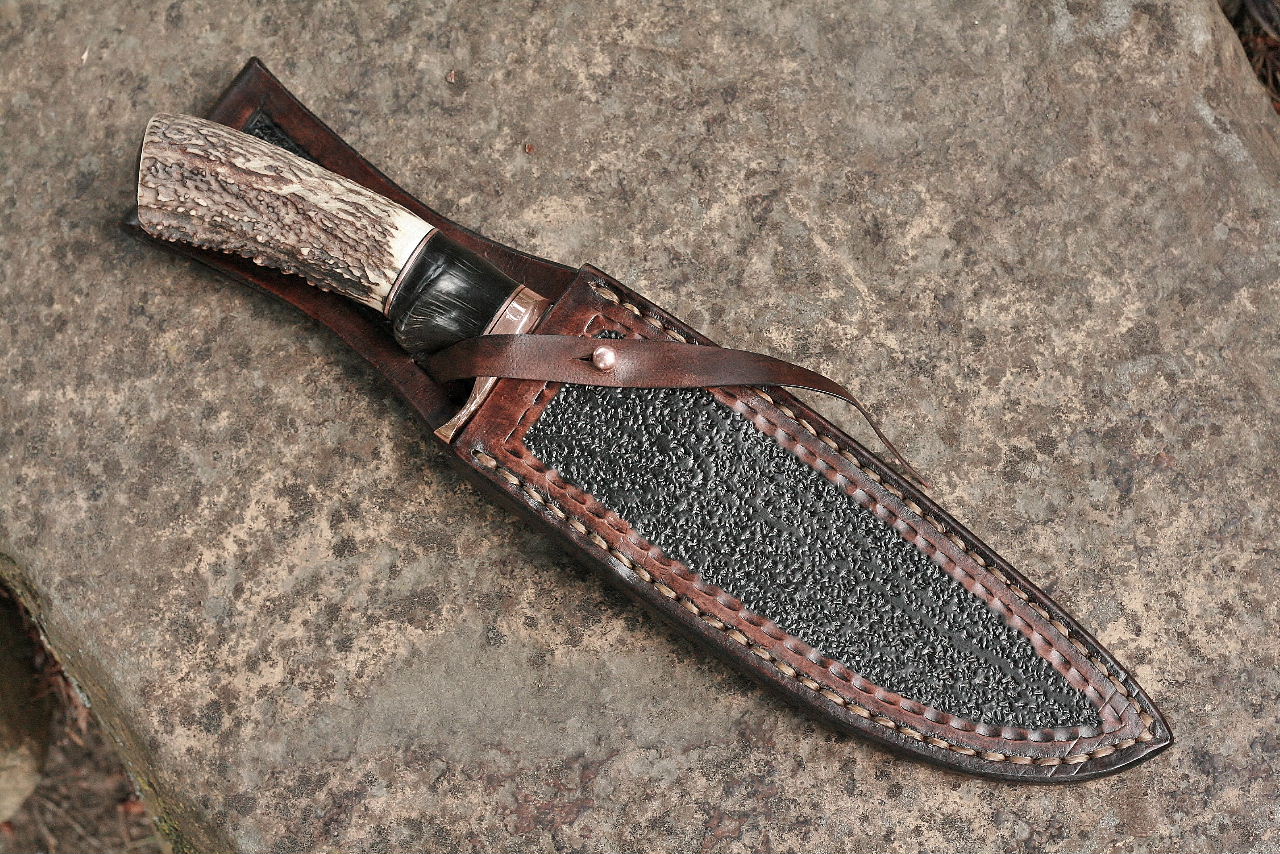 - Custom tooled leather sheath, knife fits snug